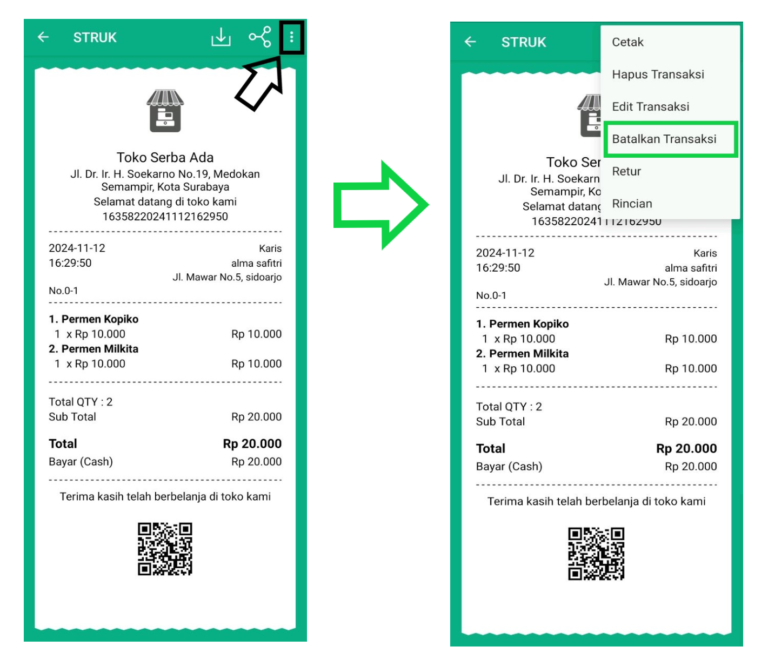 👉 Lihat panduannya disini: Cara Membatalkan Transaksi Penjualan (Kasir Pintar POS)