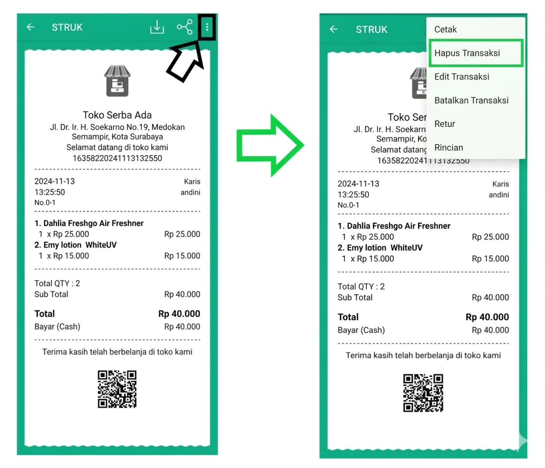 👉 Lihat panduannya disini: Cara Menghapus Transaksi Penjualan (Kasir Pintar Pro)