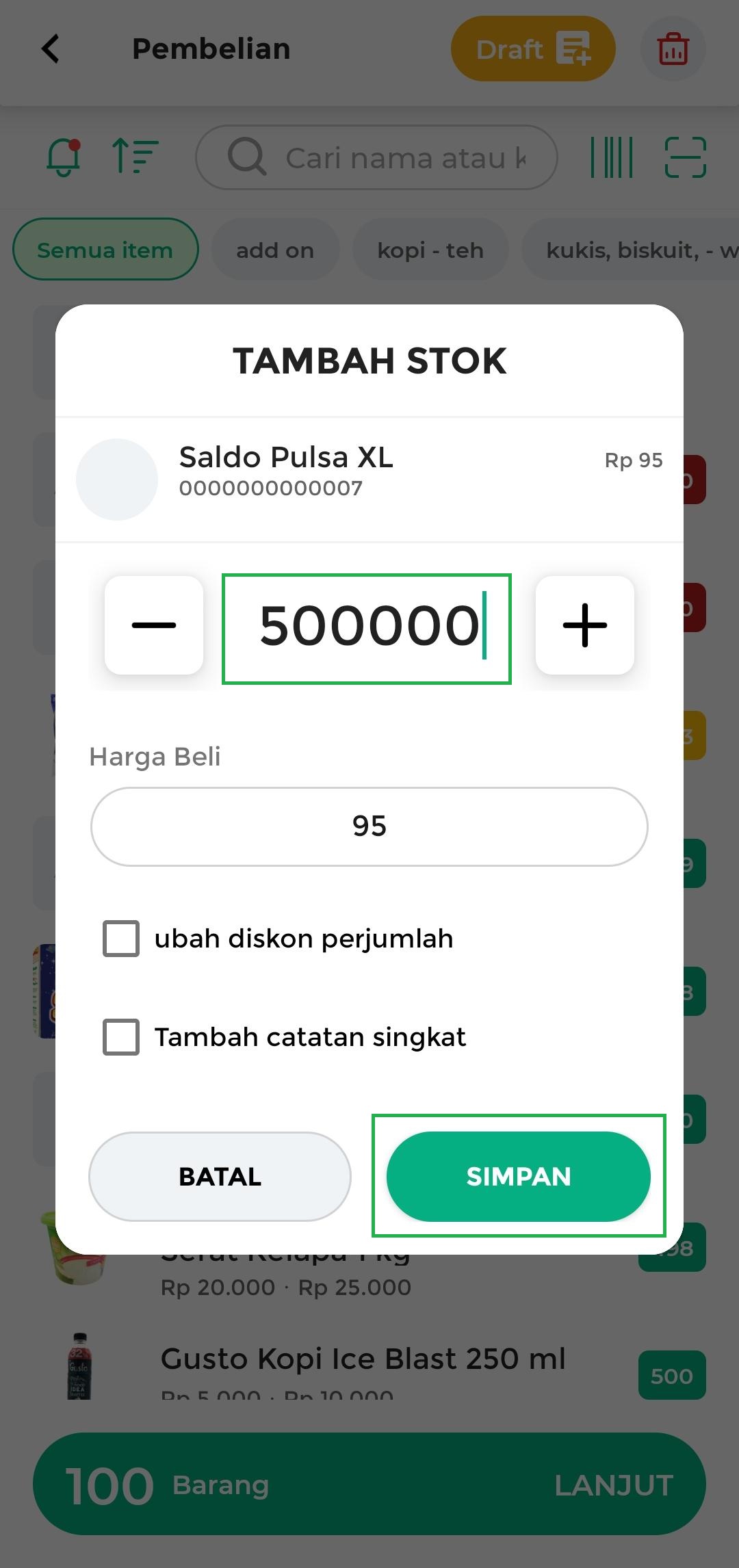 Masukkan stok sebesar 500.000. Setelah itu, klik tombol Simpan.