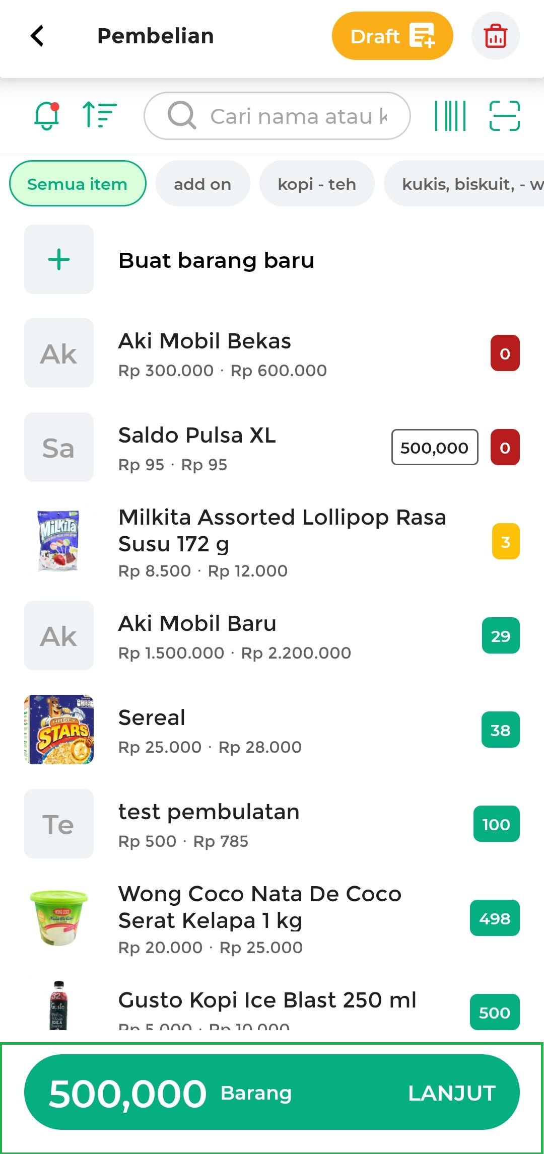 - Pilih barang yang ditransaksikan dan klik tombol Lanjut
