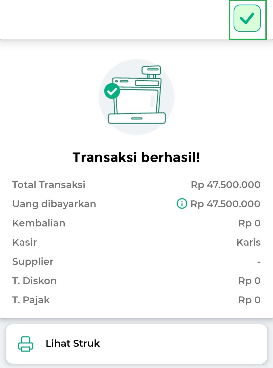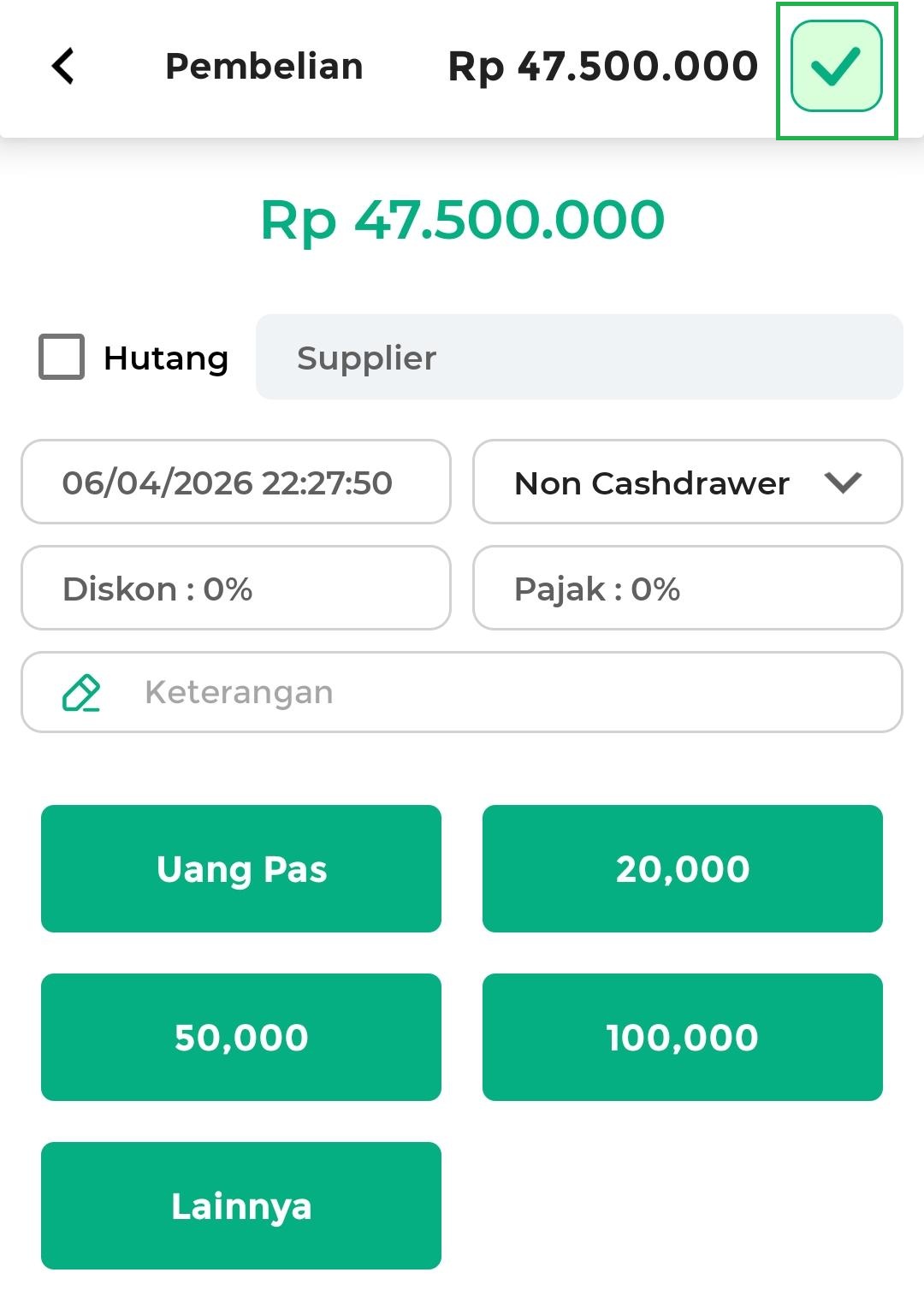 - Masukkan nominal yang dibayarkan oleh pelanggan dan isi data pembayaran lainnya sesuai dengan kebutuhan. Setelah itu, klik tombol Centang untuk menyelesaikan transaksi