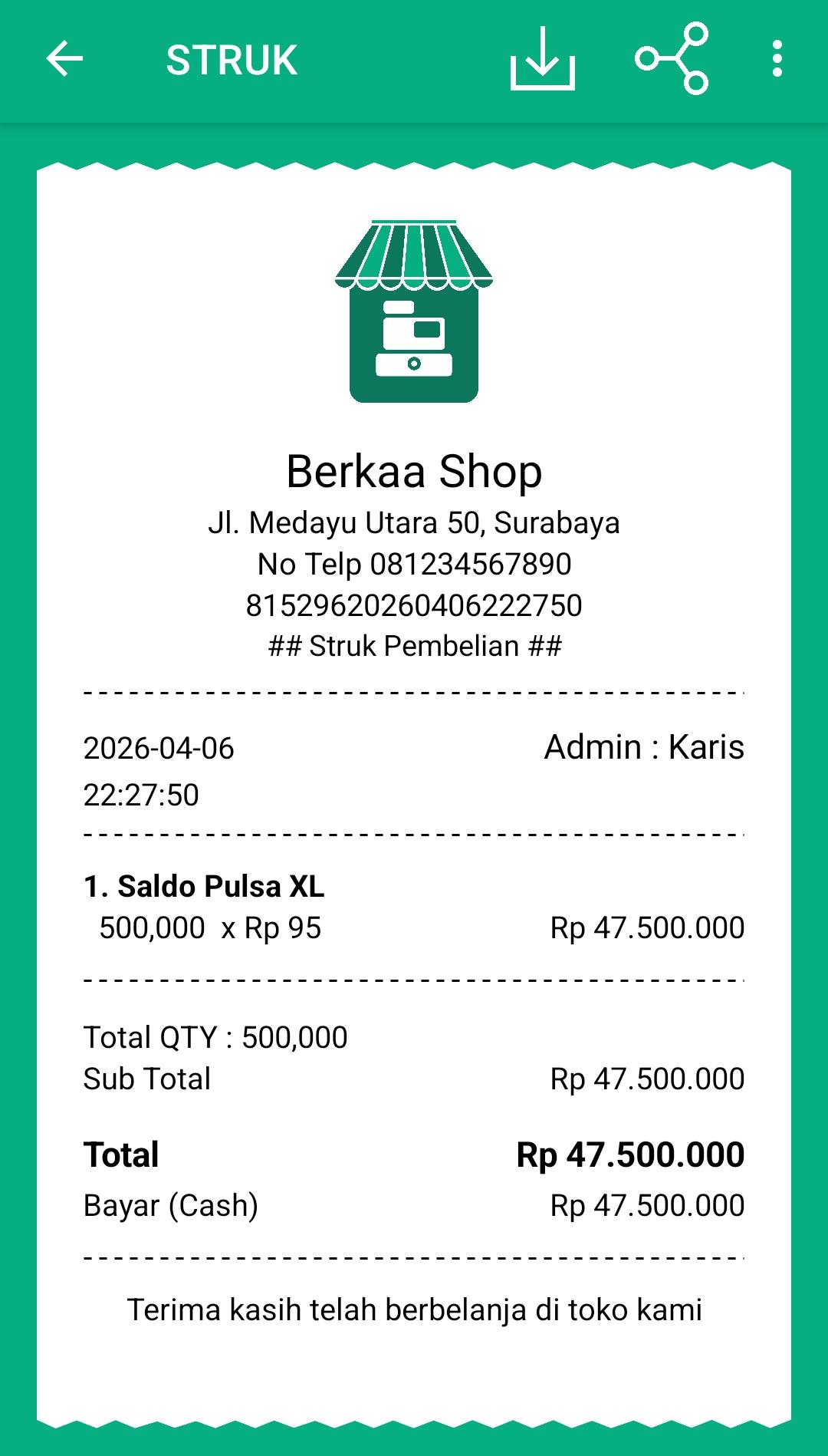 - Transaksi pembelian telah berhasil dilakukan. Berikut merupakan contoh dari struk pembelian yang telah dilakukan