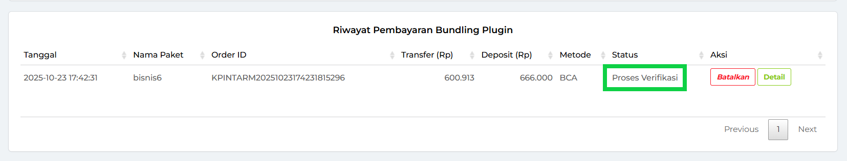 15. Setelah pembayaran terverifikasi, plugin otomatis aktif dan siap digunakan untuk mendukung operasional bisnis Anda.