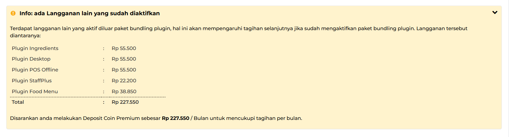 Bagian ini menampilkan informasi langganan produk berbayar di luar paket Bundling Plugin. Langganan ini akan mempengaruhi total tagihan pada pembayaran berikutnya.