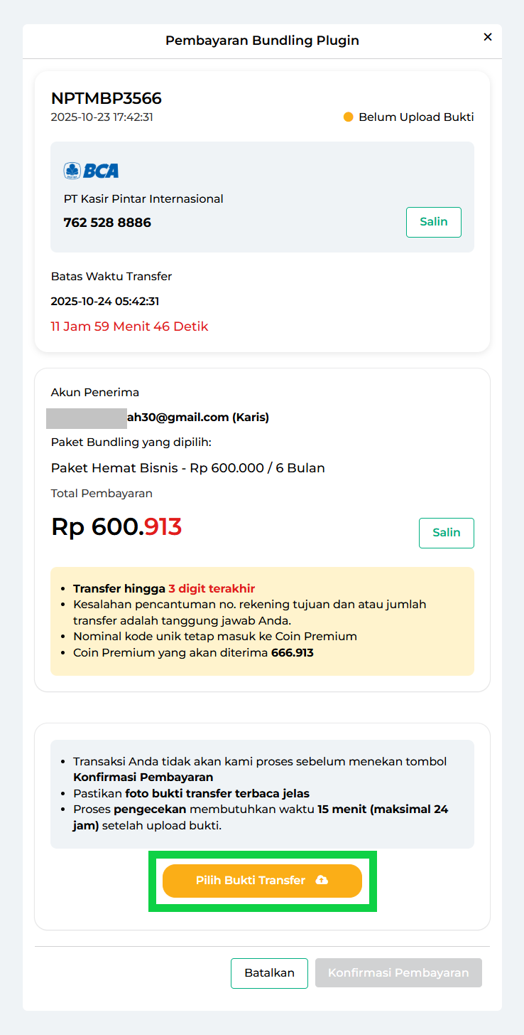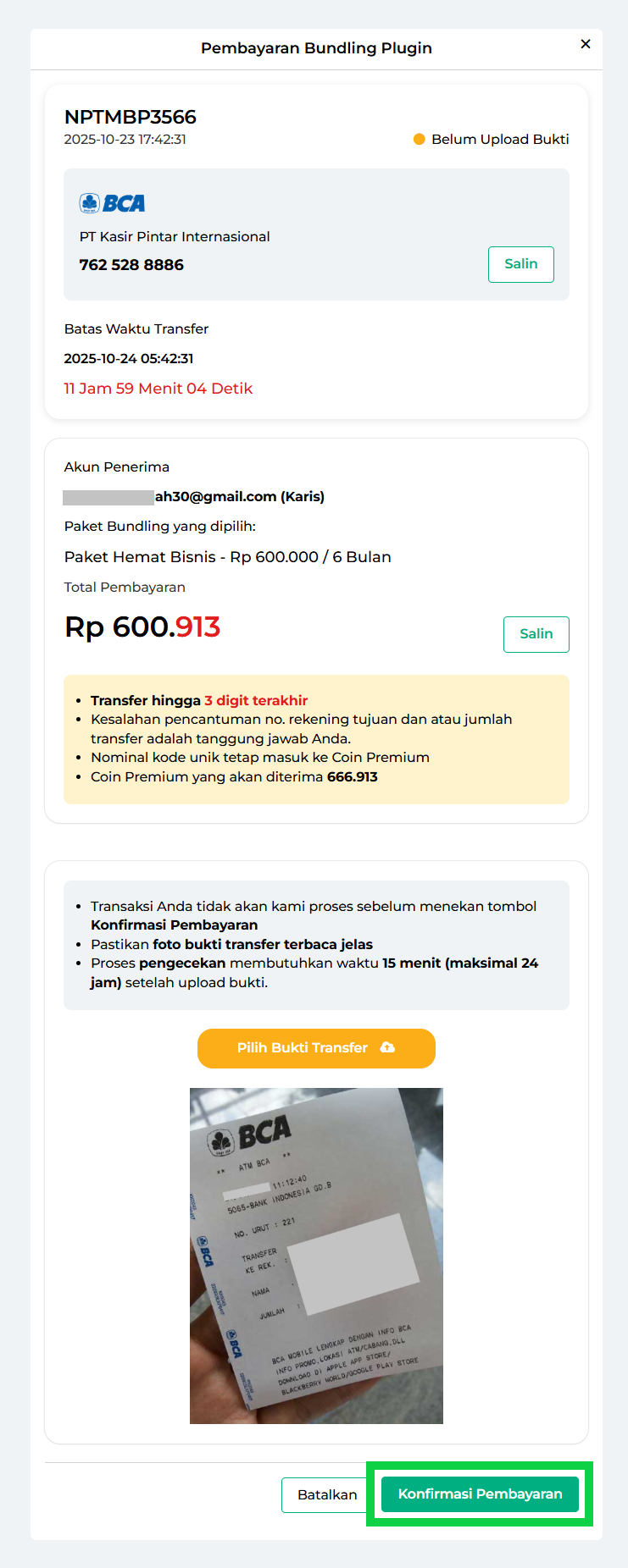 13. Klik Konfirmasi Pembayaran setelah memilih bukti transfer.