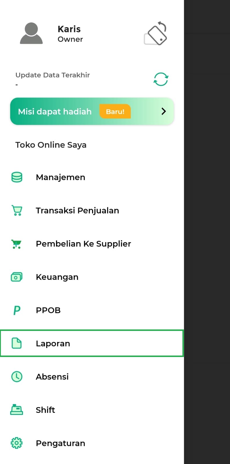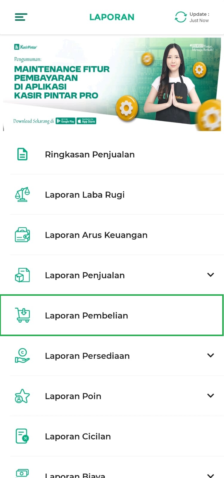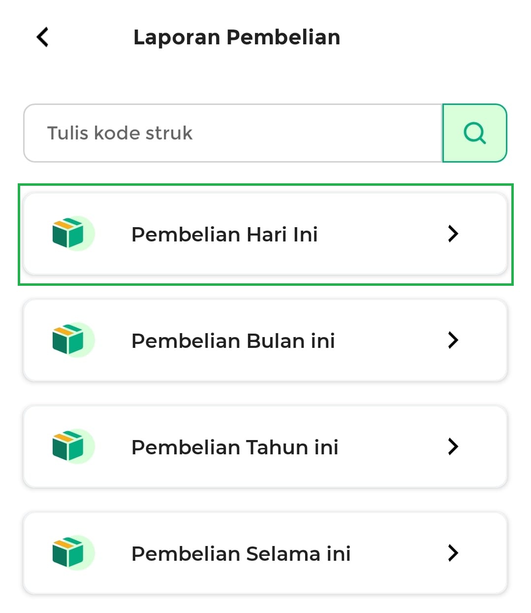 - Pilih jenis laporan transaksi pembelian yang ingin ditampilkan, sebagai contoh Karis pilih Pembelian Hari Ini.