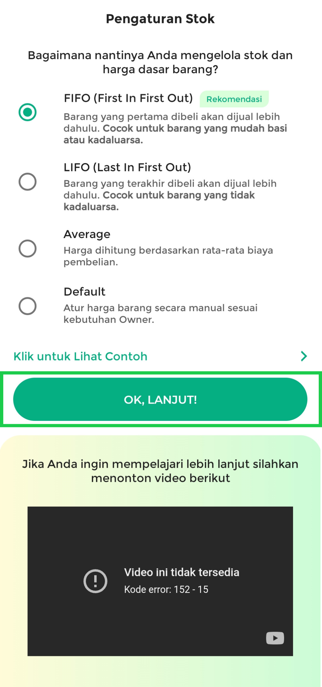 - Pilih metode pengaturan stok yang sesuai dengan bidang usaha Anda, lalu klik tombol OK, Lanjut! untuk melanjutkan.