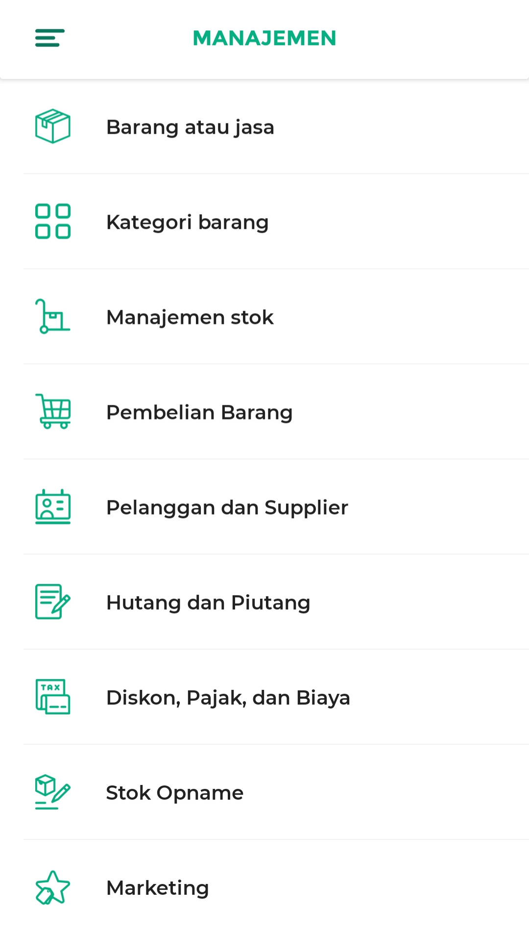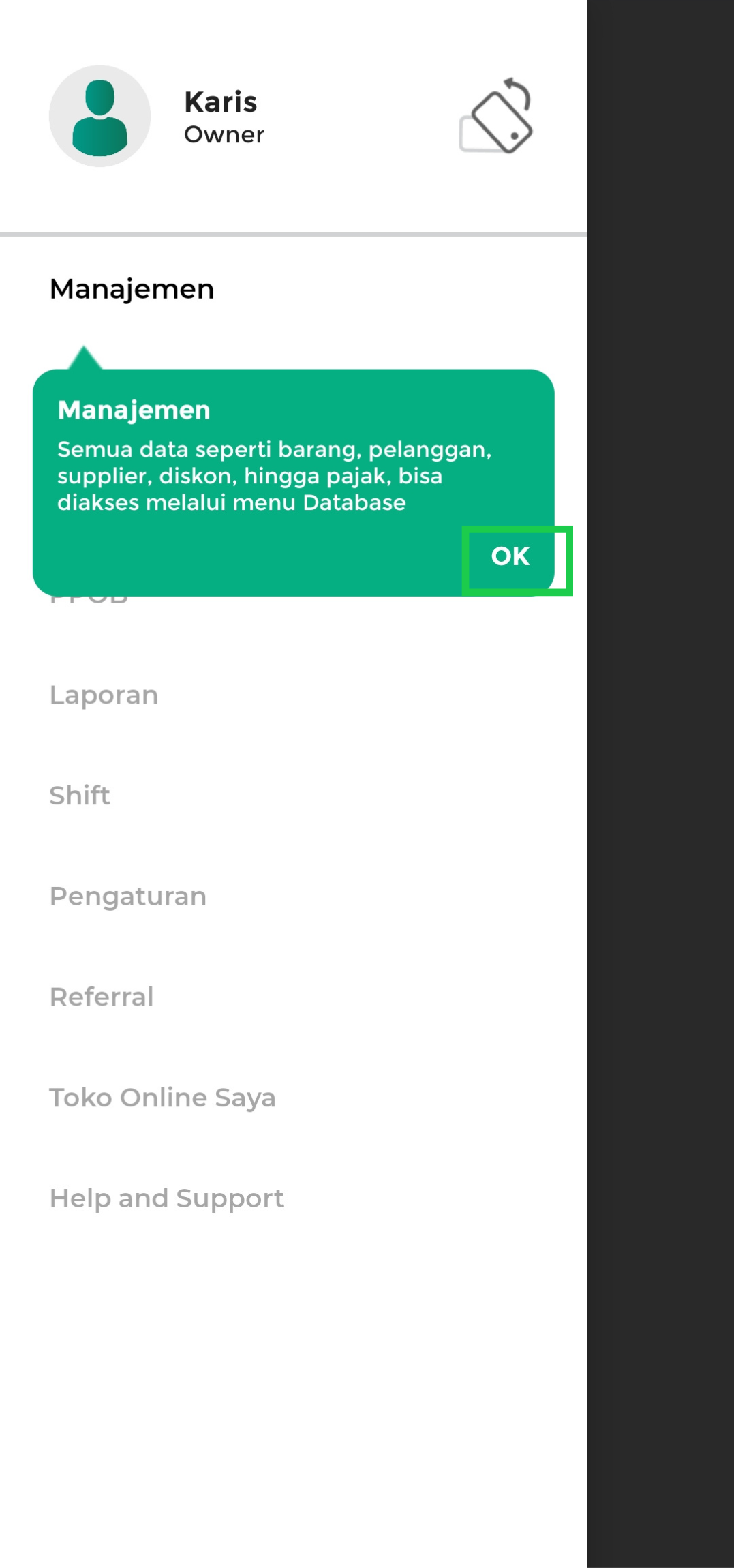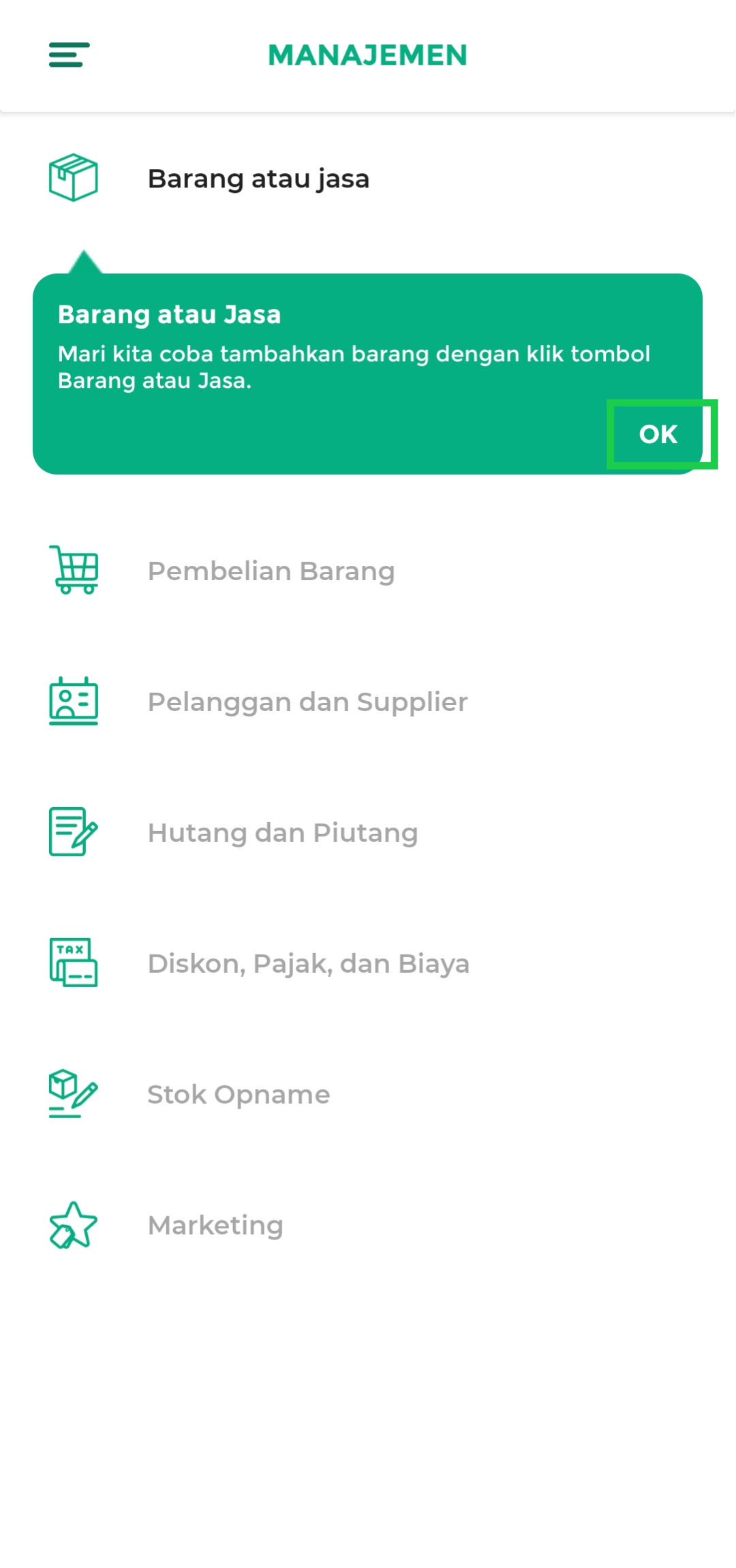 Menu Manajemen digunakan untuk mengelola data operasional toko, seperti data barang atau jasa, pelanggan, supplier, diskon, pajak, biaya, marketing, hingga komisi staf. Klik “OK” untuk melanjutkan pengenalan fitur.