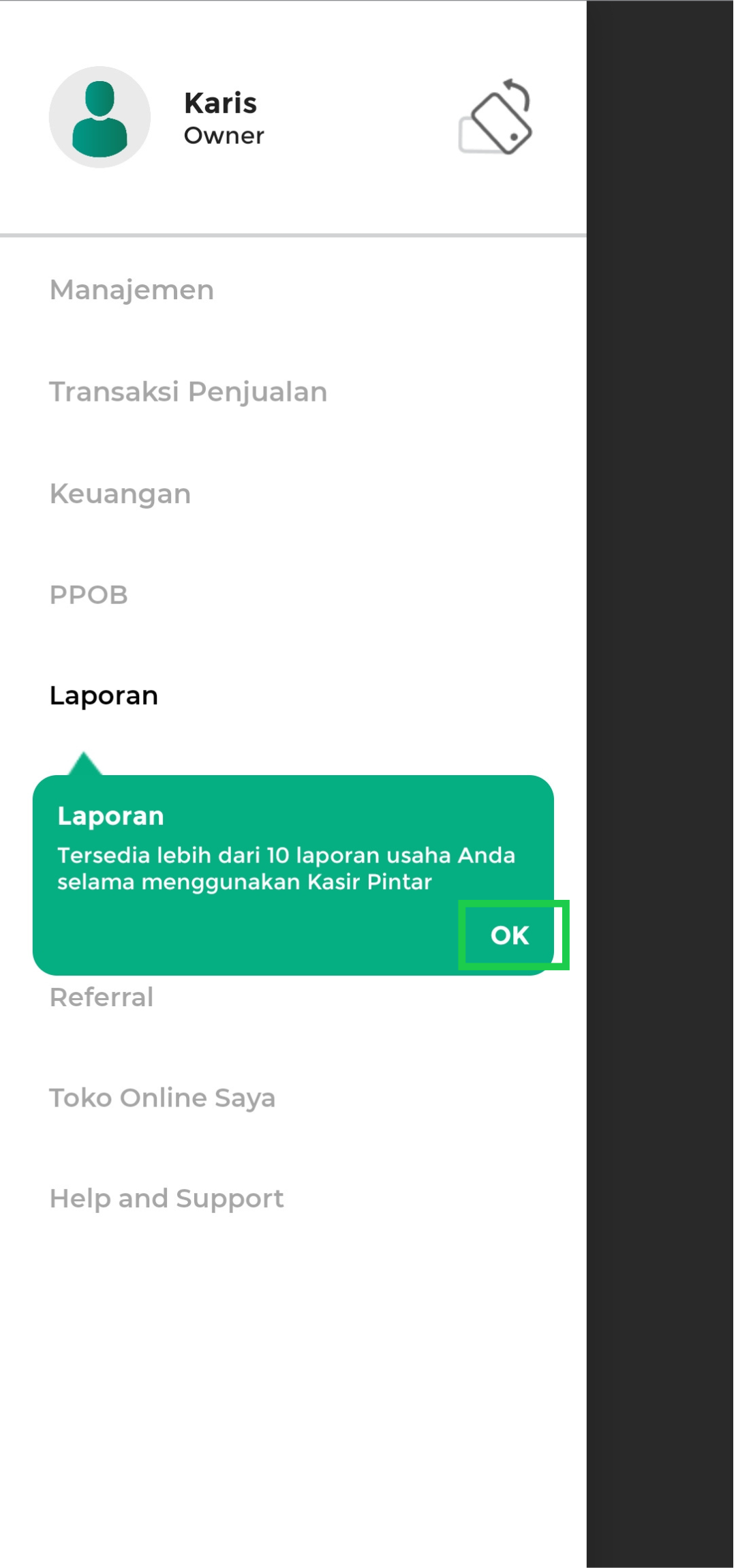 - Menu Laporan menampilkan ringkasan dan detail laporan usaha. Klik “OK” untuk melanjutkan.