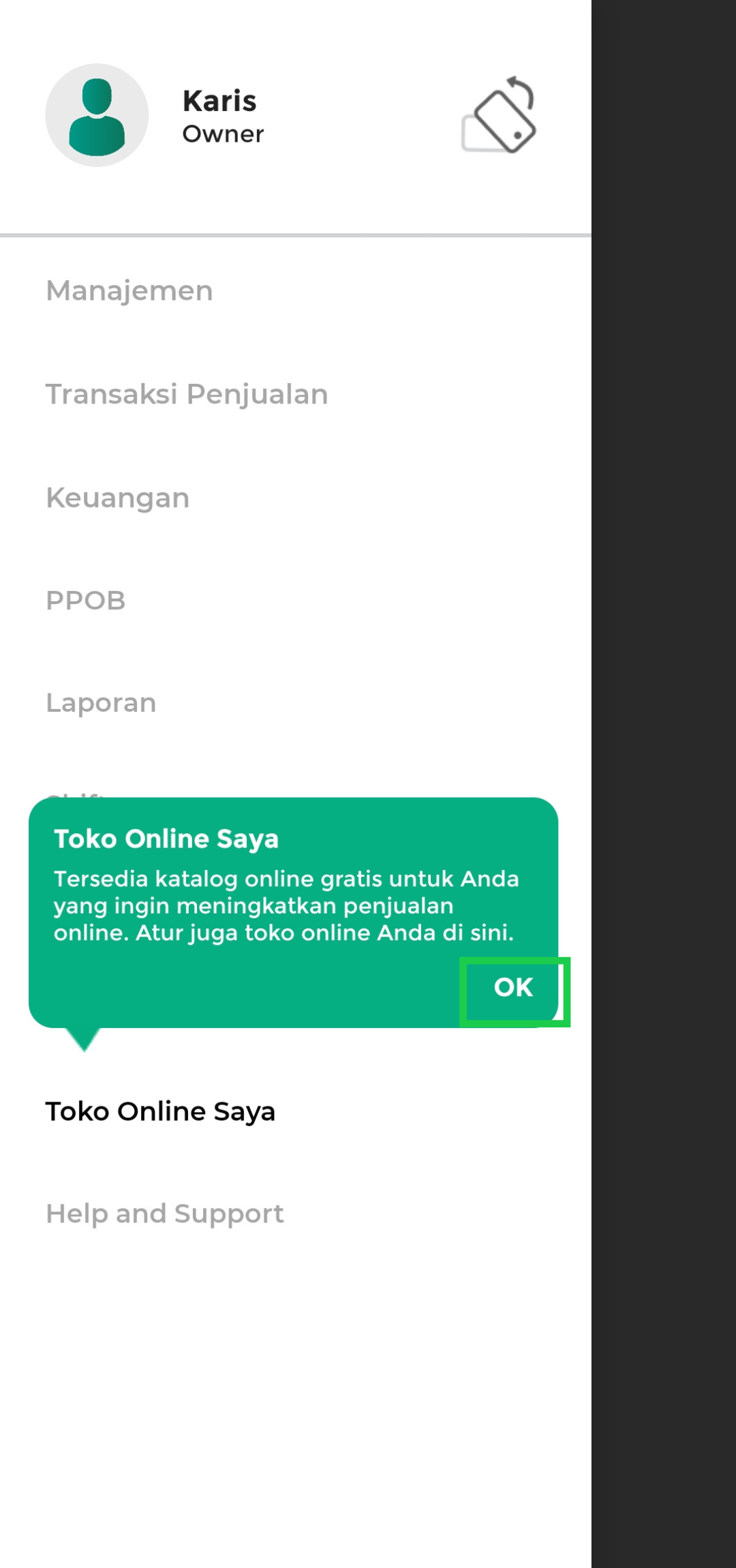 - Menu Toko Online Saya dapat digunakan sebagai katalog online dan menjual produk secara online. Klik “OK” untuk melanjutkan.