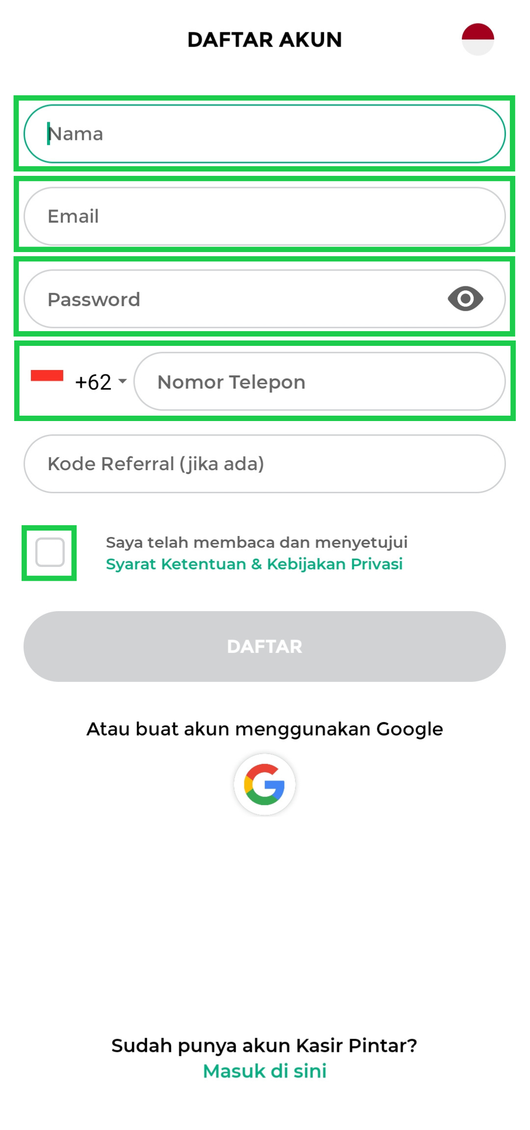Jika memiliki kode referral, Anda dapat mengisinya pada kolom Kode Referral (opsional).