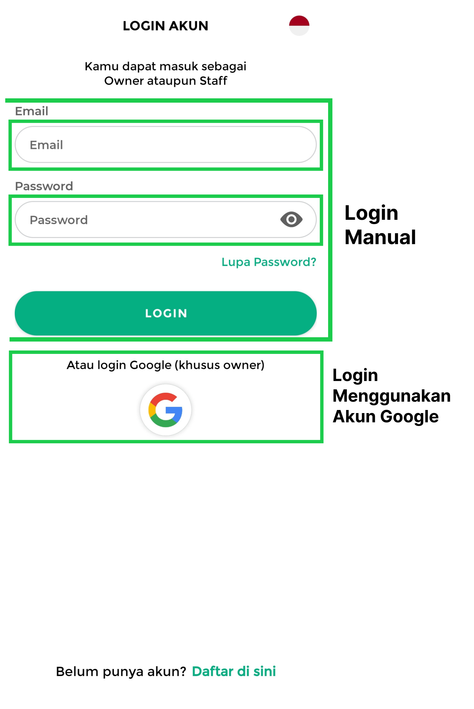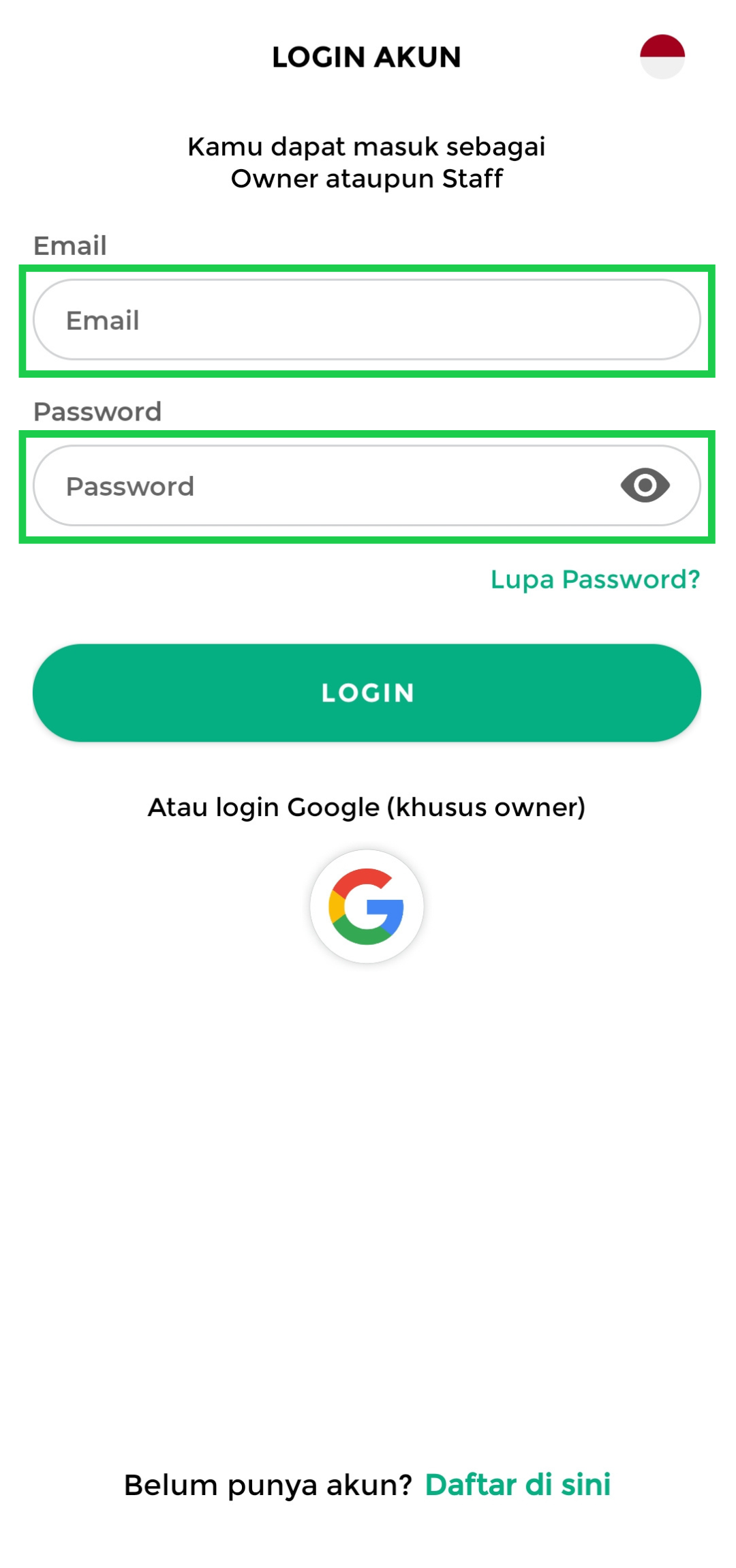 Anda hanya perlu memasukkan alamat email dan kata sandi (password) dari akun owner atau staf yang terkait pada kolom yang tersedia. Pastikan informasi yang dimasukkan benar agar dapat mengakses fitur yang sesuai dengan peran Anda.