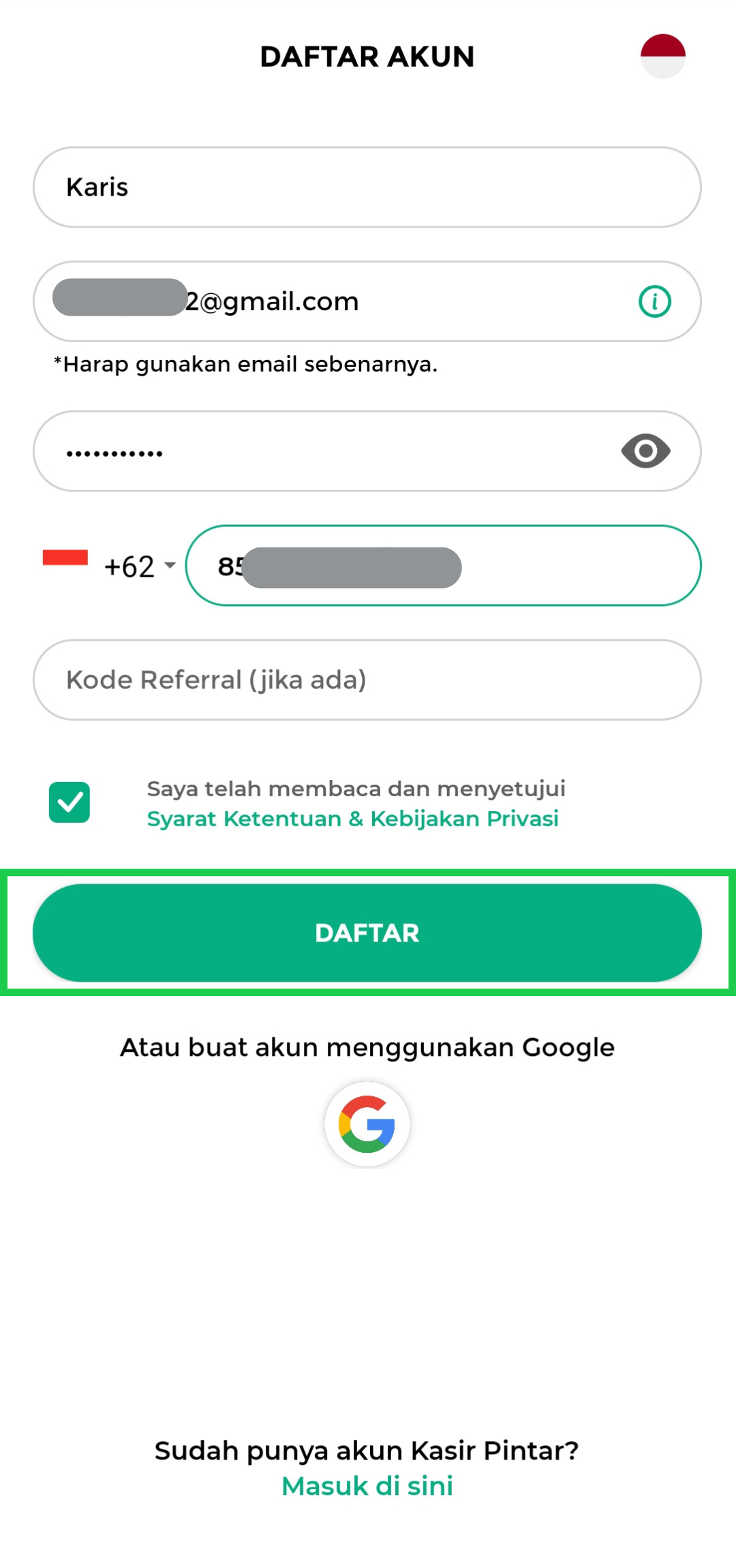 Lengkapi form pendaftaran akun dengan mengisi nama lengkap, email, password, dan nomor telepon aktif. Jika memiliki kode referral, Anda dapat mengisinya pada kolom Kode Referral (opsional).