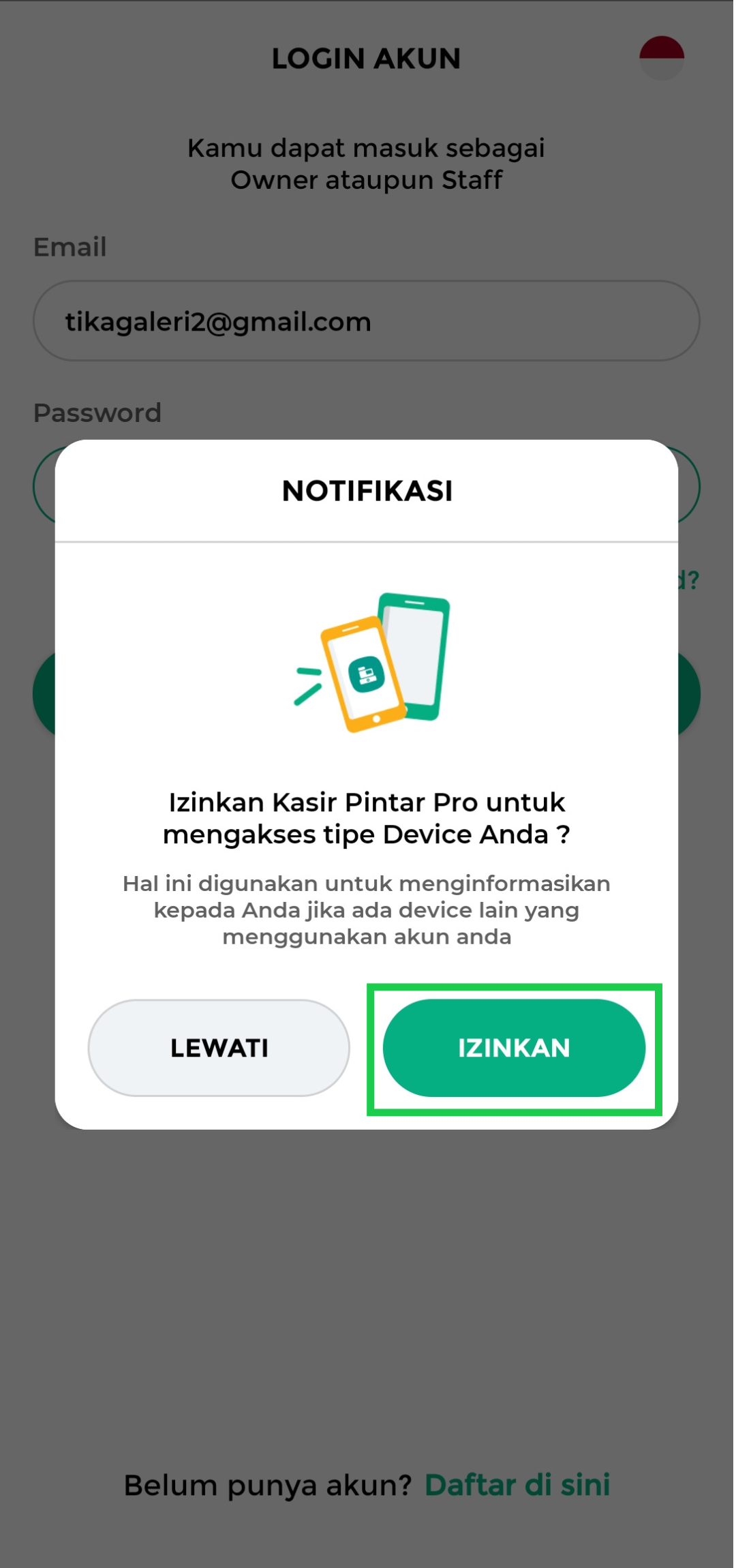 Untuk login di aplikasi Kasir Pintar Pro, tidak ada perbedaan antara akun owner dan akun staf.