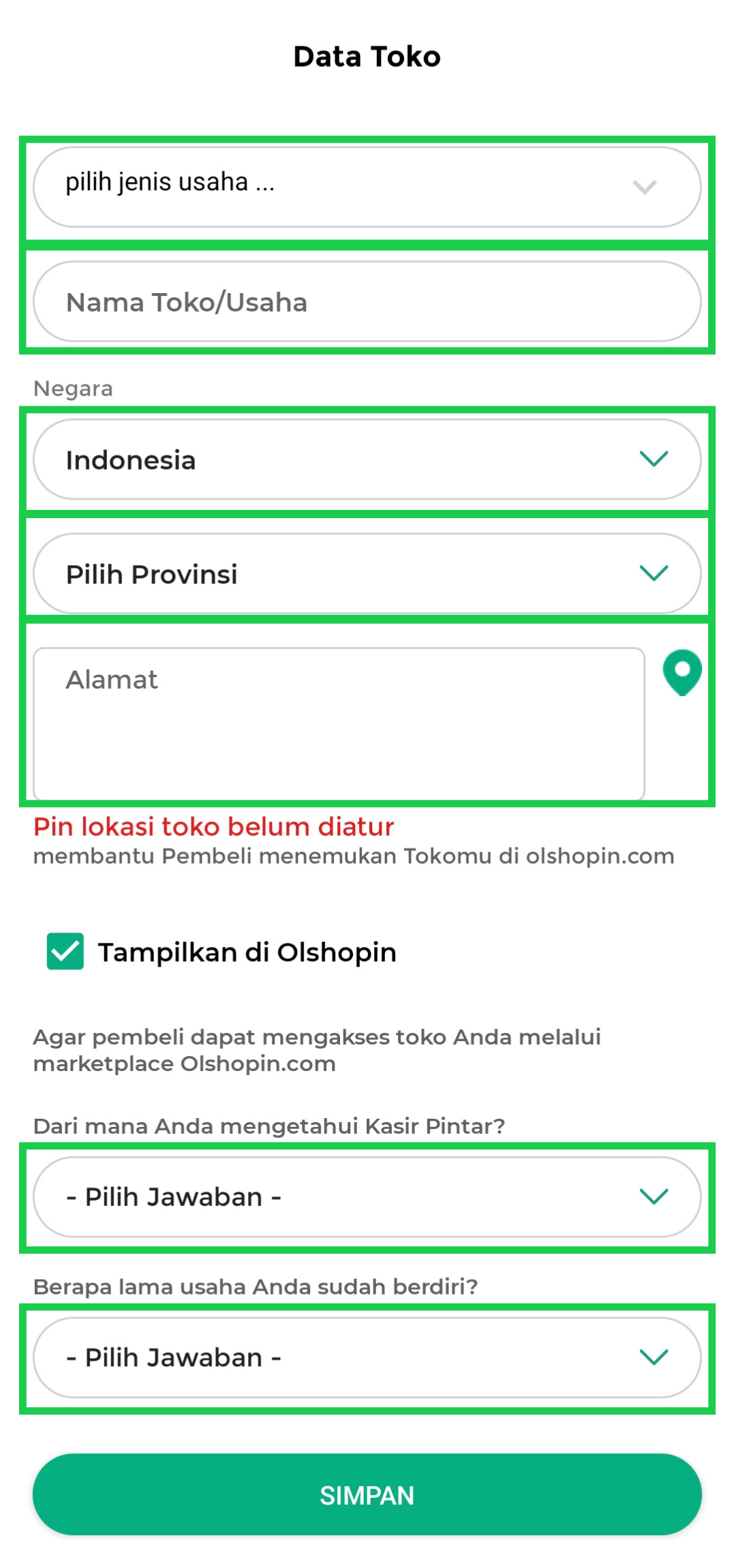 - Lengkapi Data Toko secara lengkap pada kolom berikut: