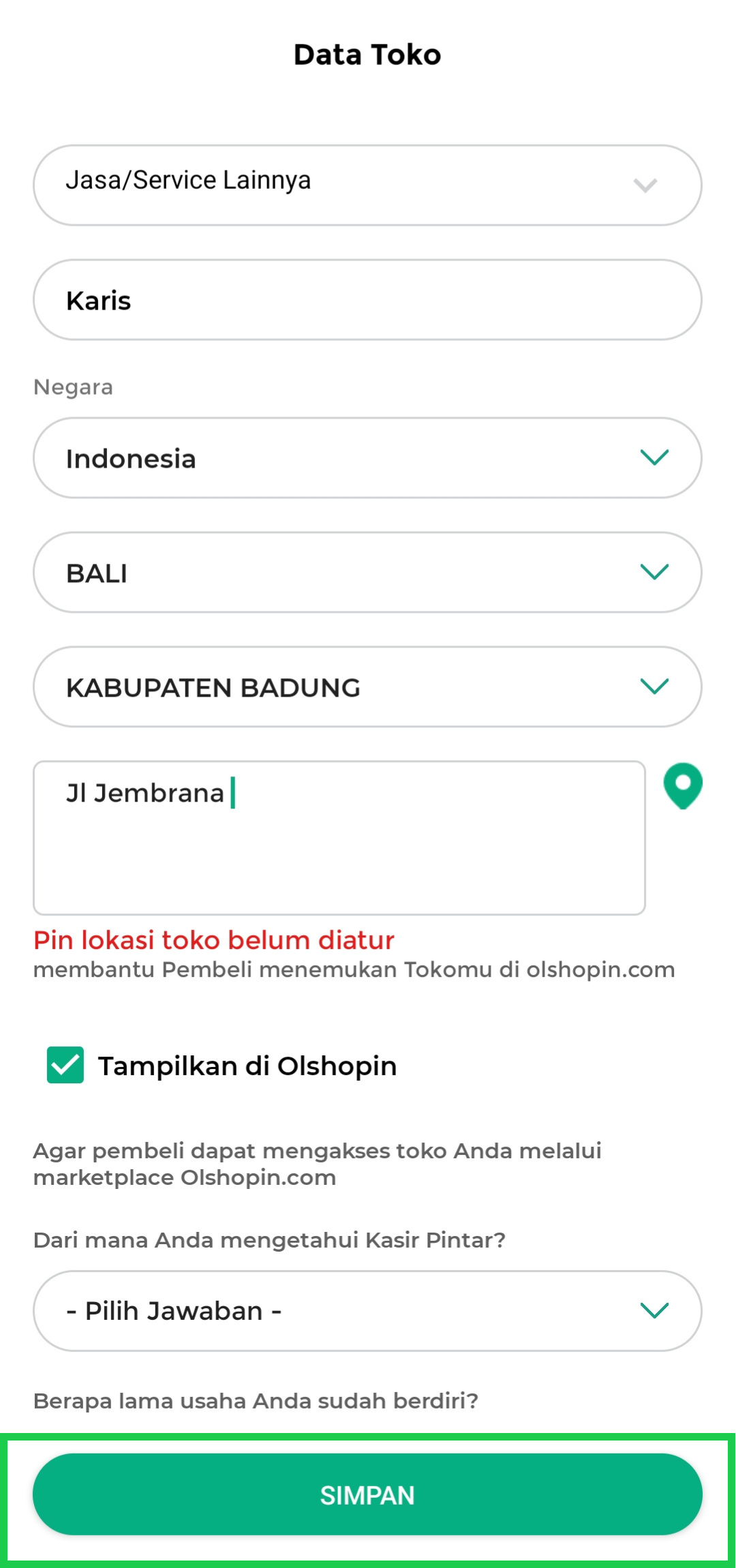 Pilih durasi usaha sesuai dengan kondisi bisnis Anda. - Periksa kembali data yang diisi, lalu klik tombol Simpan untuk menyimpan pengaturan toko.