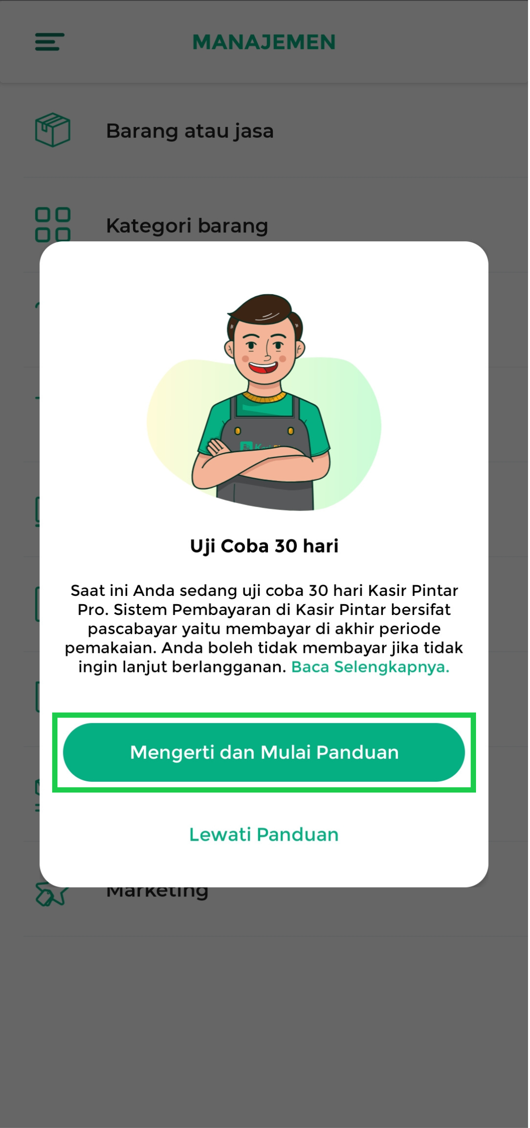 - Klik Mengerti dan Mulai Panduan untuk memulai panduan penggunaan aplikasi dan mengenal fitur-fitur utama Kasir Pintar Pro.