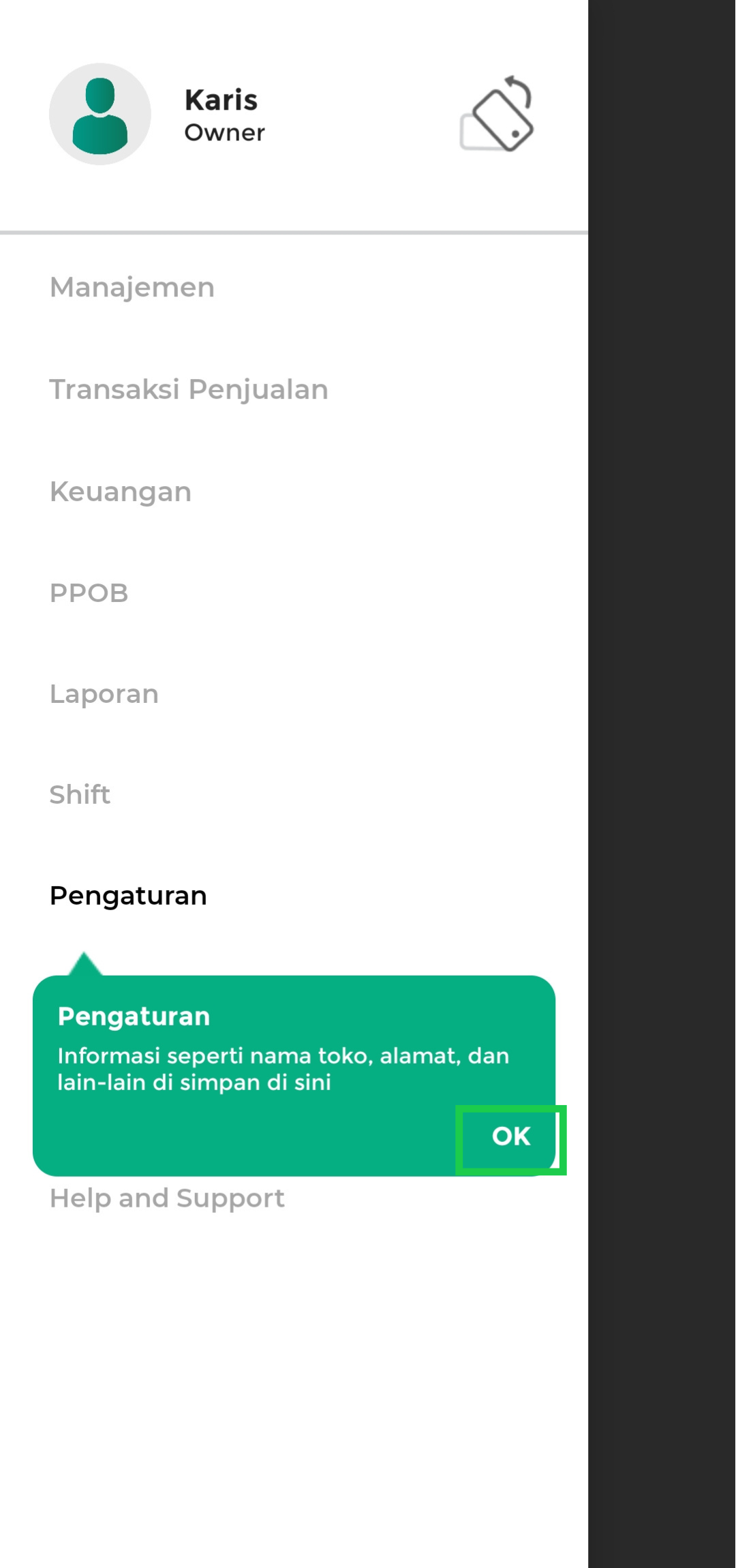 - Menu Pengaturan digunakan untuk mengatur informasi toko, profil, manajemen staf, metode pembayaran, sinkronisasi, printer dan struk, dan pengaturan lainnya. Klik “OK” untuk melanjutkan.