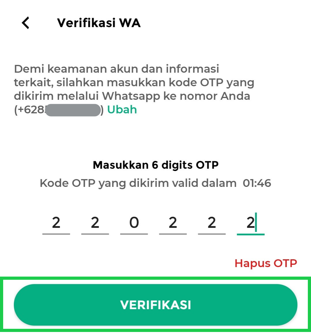 - Masukkan kode OTP yang dikirim melalui WhatsApp, lalu klik tombol Verifikasi untuk melanjutkan.