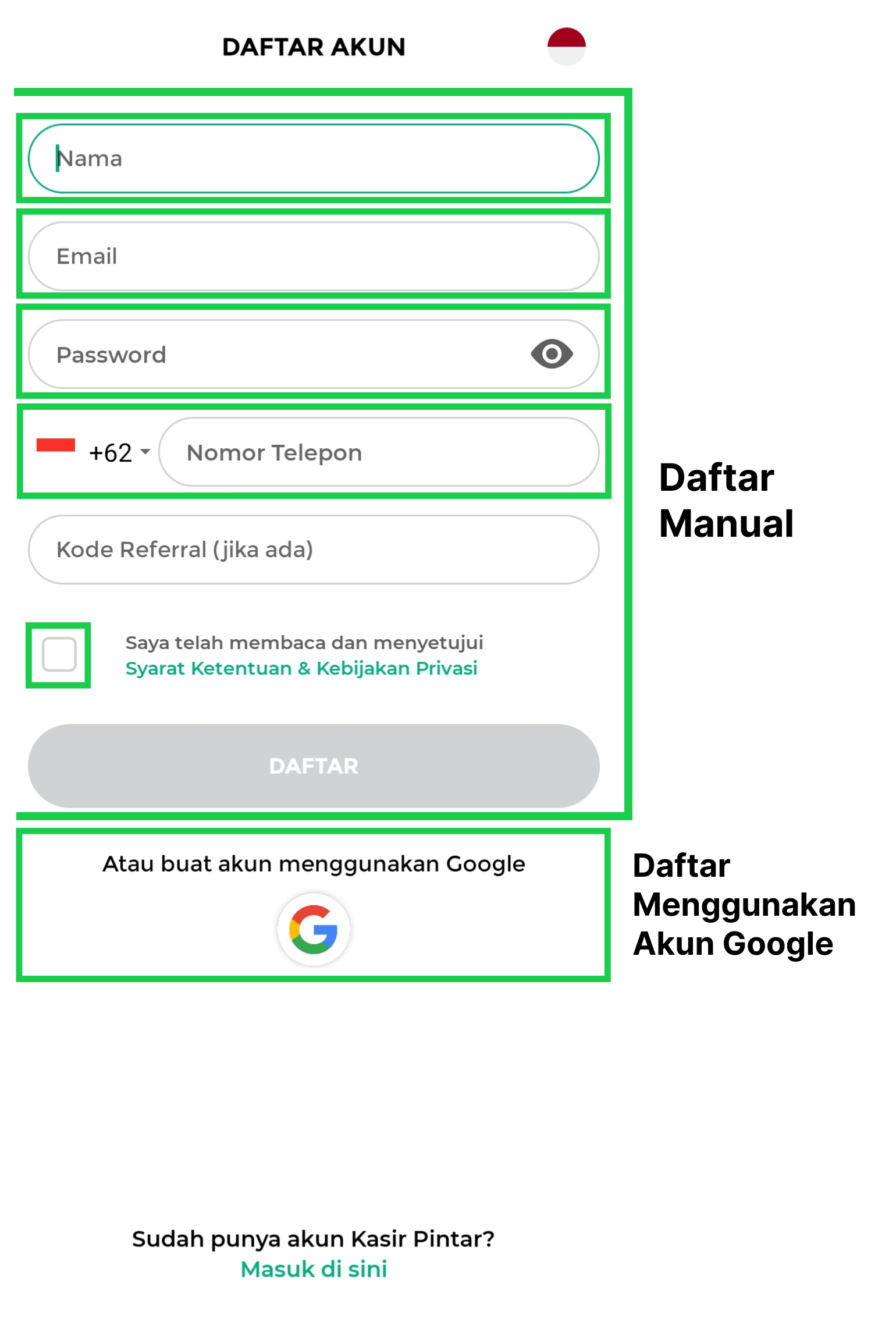 Sebagai alternatif, Anda juga dapat melakukan pendaftaran akun menggunakan Google dengan memilih opsi Google pada halaman pendaftaran.