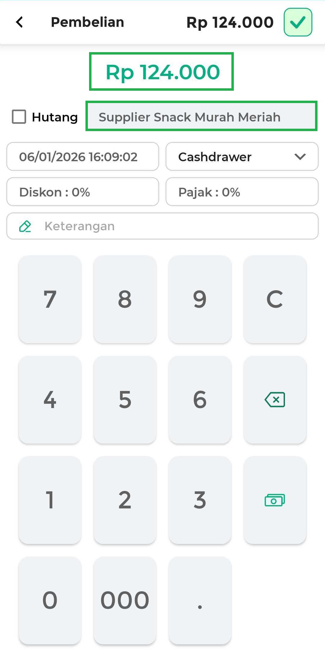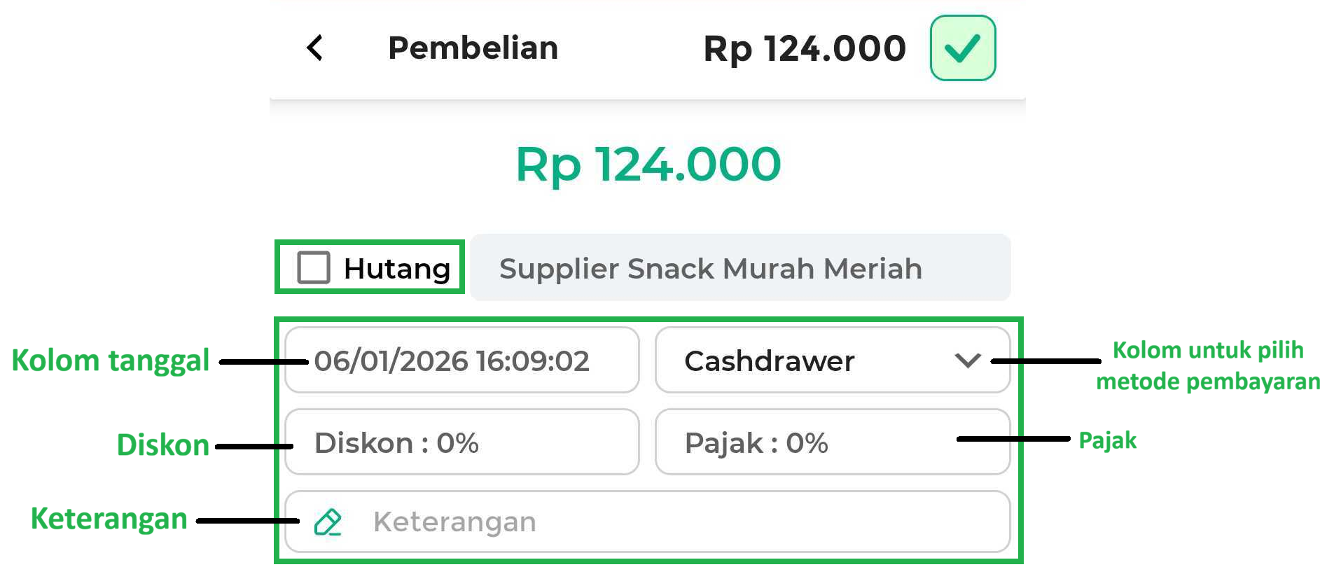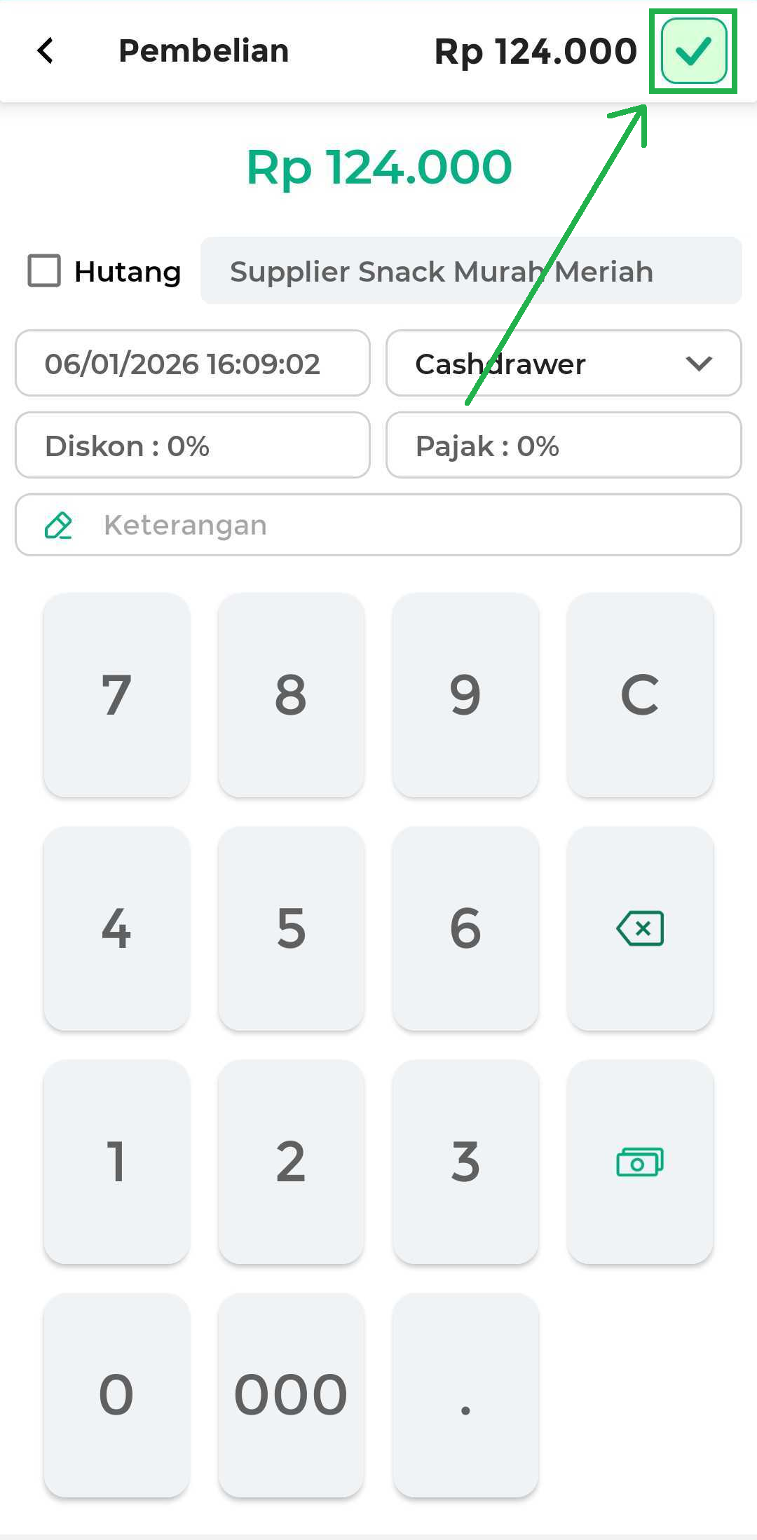 - Setelah melengkapi data pembayaran, klik ikon centang di pojok kanan atas untuk menyelesaikan transaksi pembelian ke supplier.