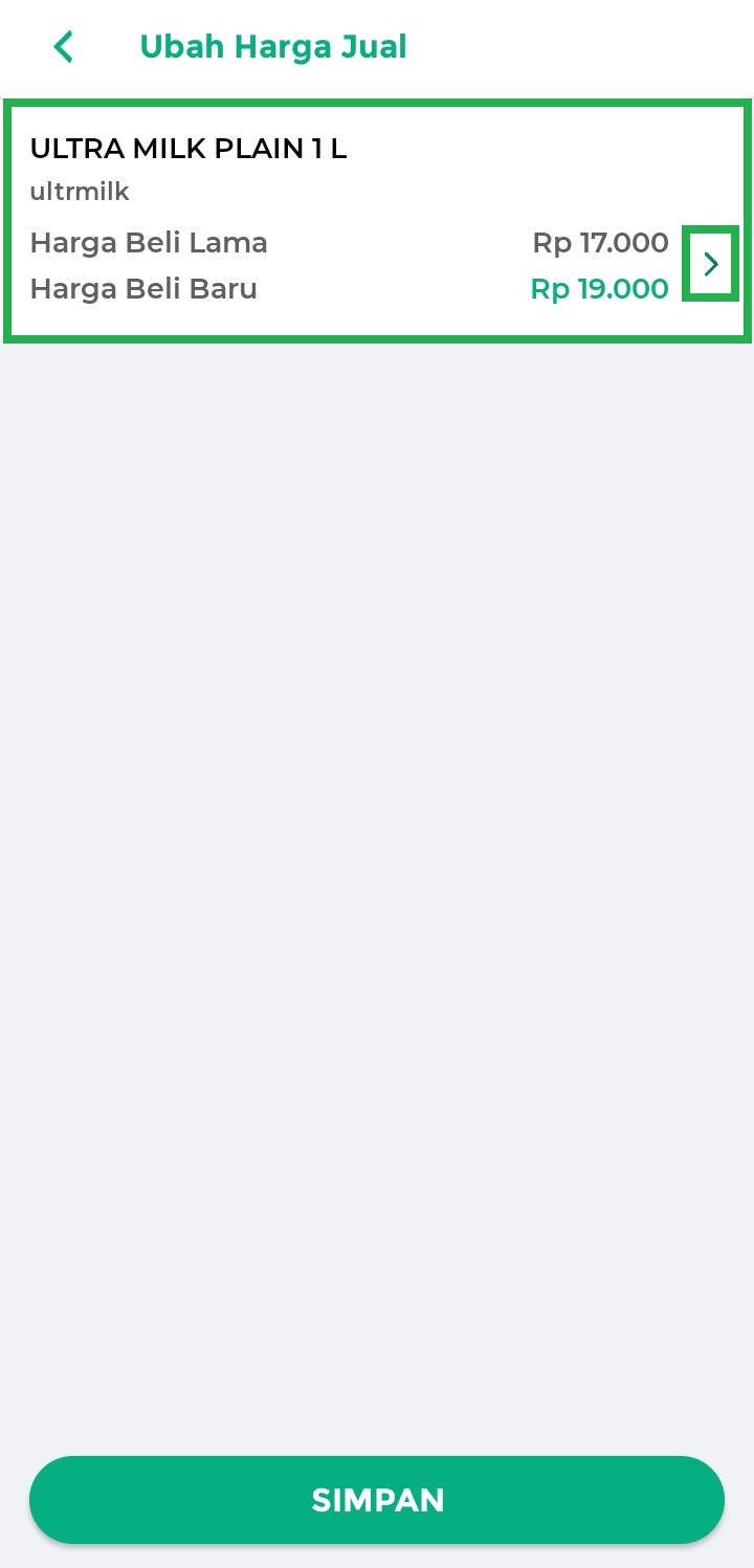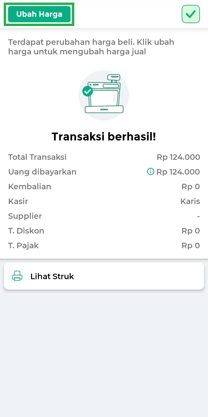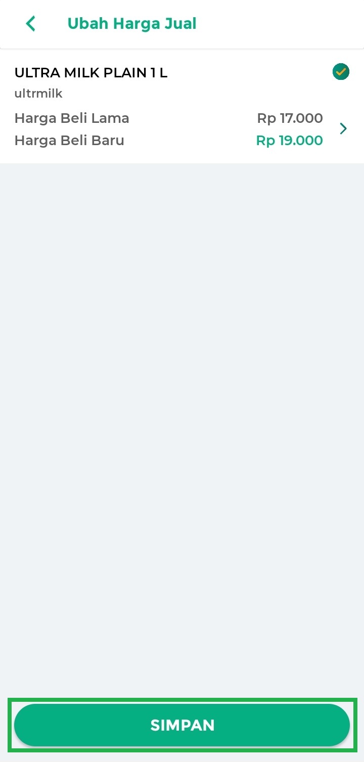 - Pada halaman ubah harga jual, ditampilkan informasi Harga Beli Lama dan Harga Beli Baru yang telah Anda atur sebelumnya, lalu klik ikon centang di sisi kanan.