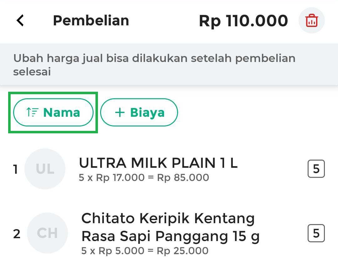 Pada halaman keranjang pembelian, klik tombol Nama untuk mengurutkan nama barang sesuai abjad secara ascending (A-Z).