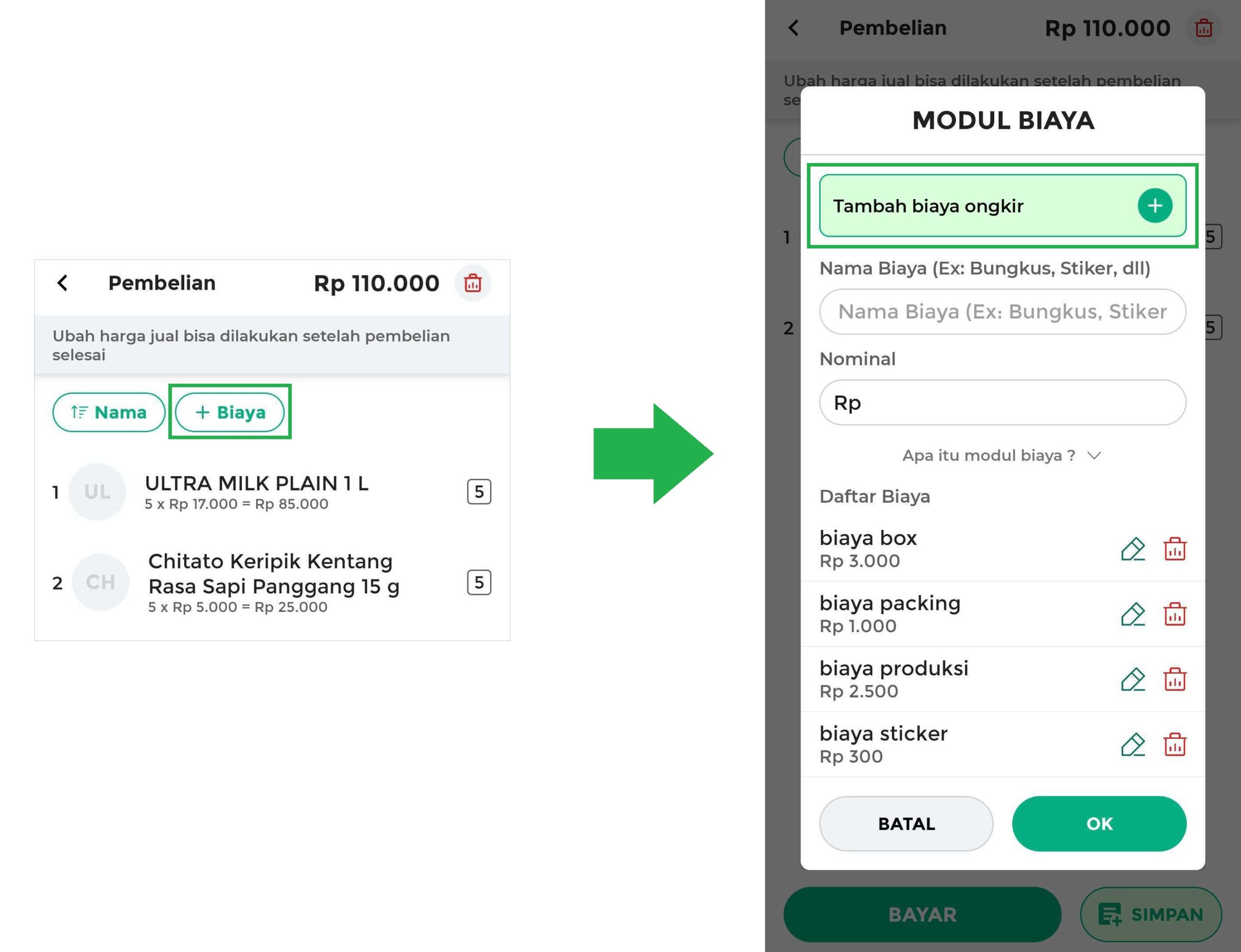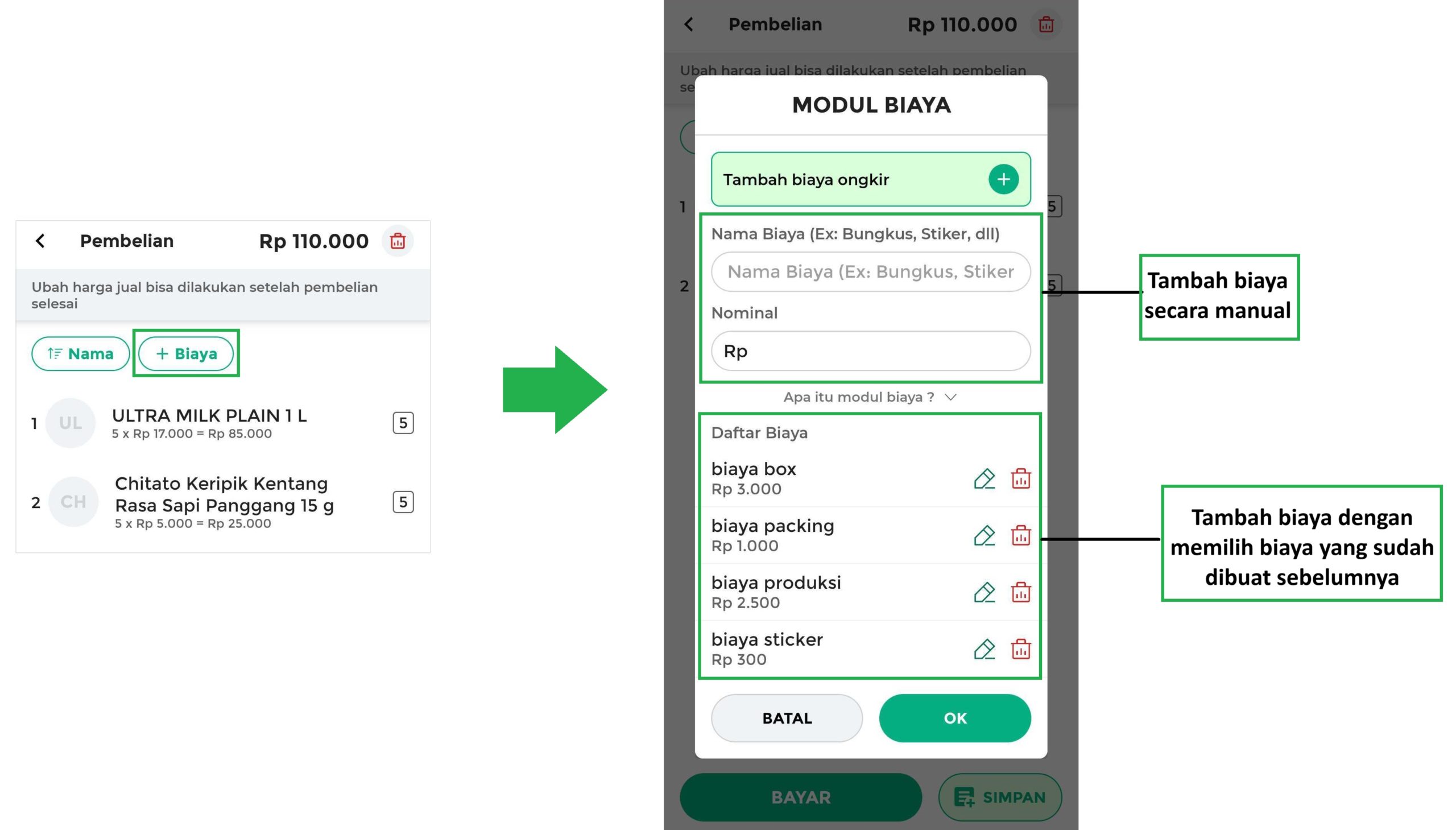 Klik tombol +Biaya untuk menambahkan Biaya Tambahan atau Biaya Ongkir, berikut penjelasannya:
