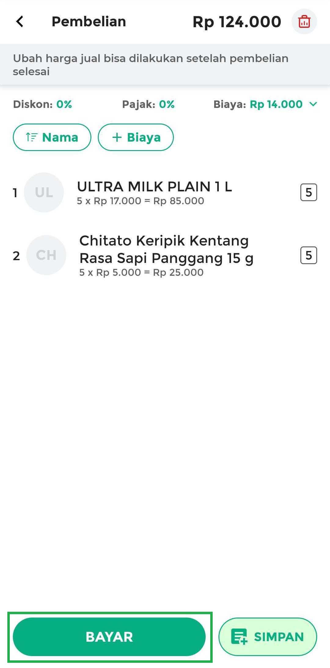 – Centang opsi ubah diskon per item, tambahkan diskon dalam bentuk persen atau rupiah sesuai kebutuhan.