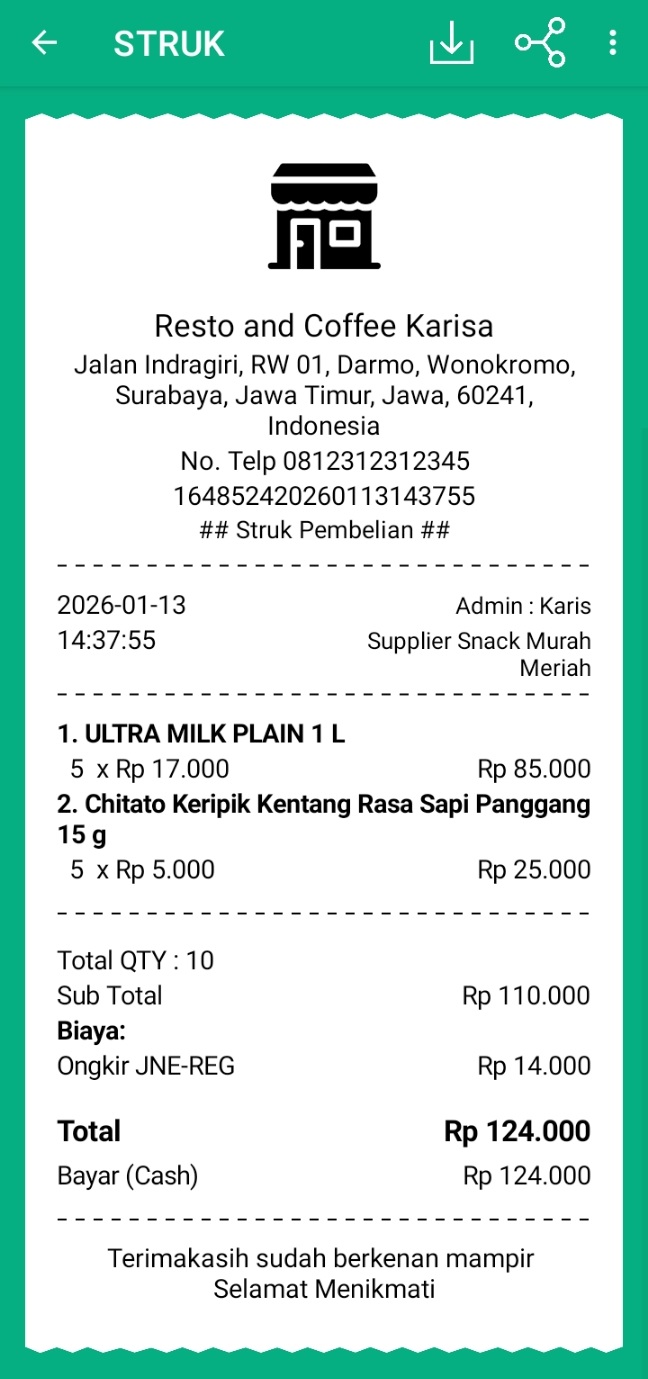 Berikut adalah contoh struk transaksi pembelian barang ke supplier yang telah dilakukan.