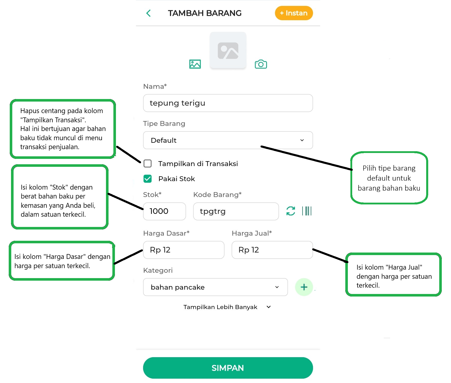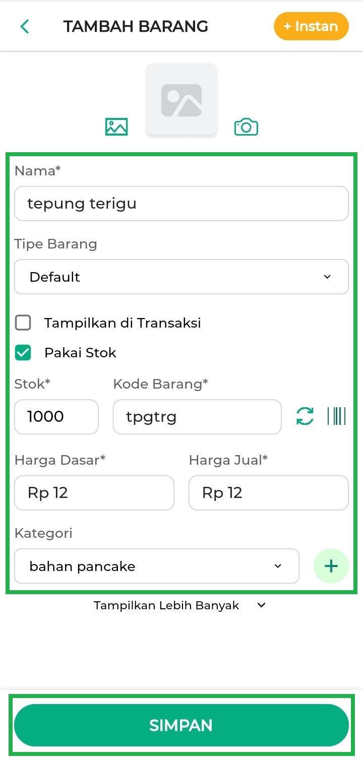 - Centang opsi Tampilkan Di Transaksi unuk menampilkan barang di halaman Transaksi Penjualan.