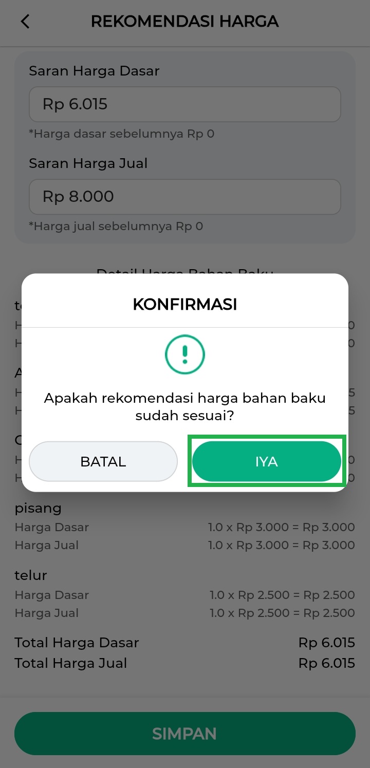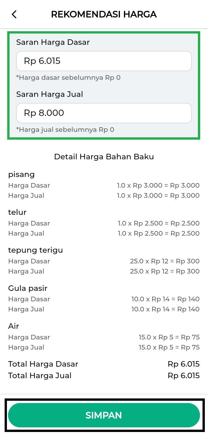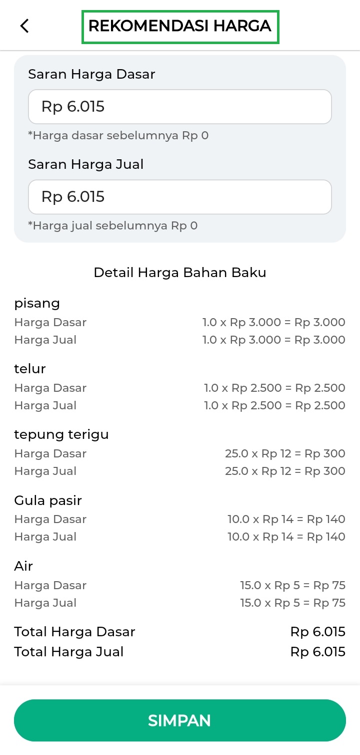 - Selanjutnya, sistem menampilkan halaman Rekomendasi Harga beserta detail perhitungan harga dasar dan harga jual dari bahan baku.