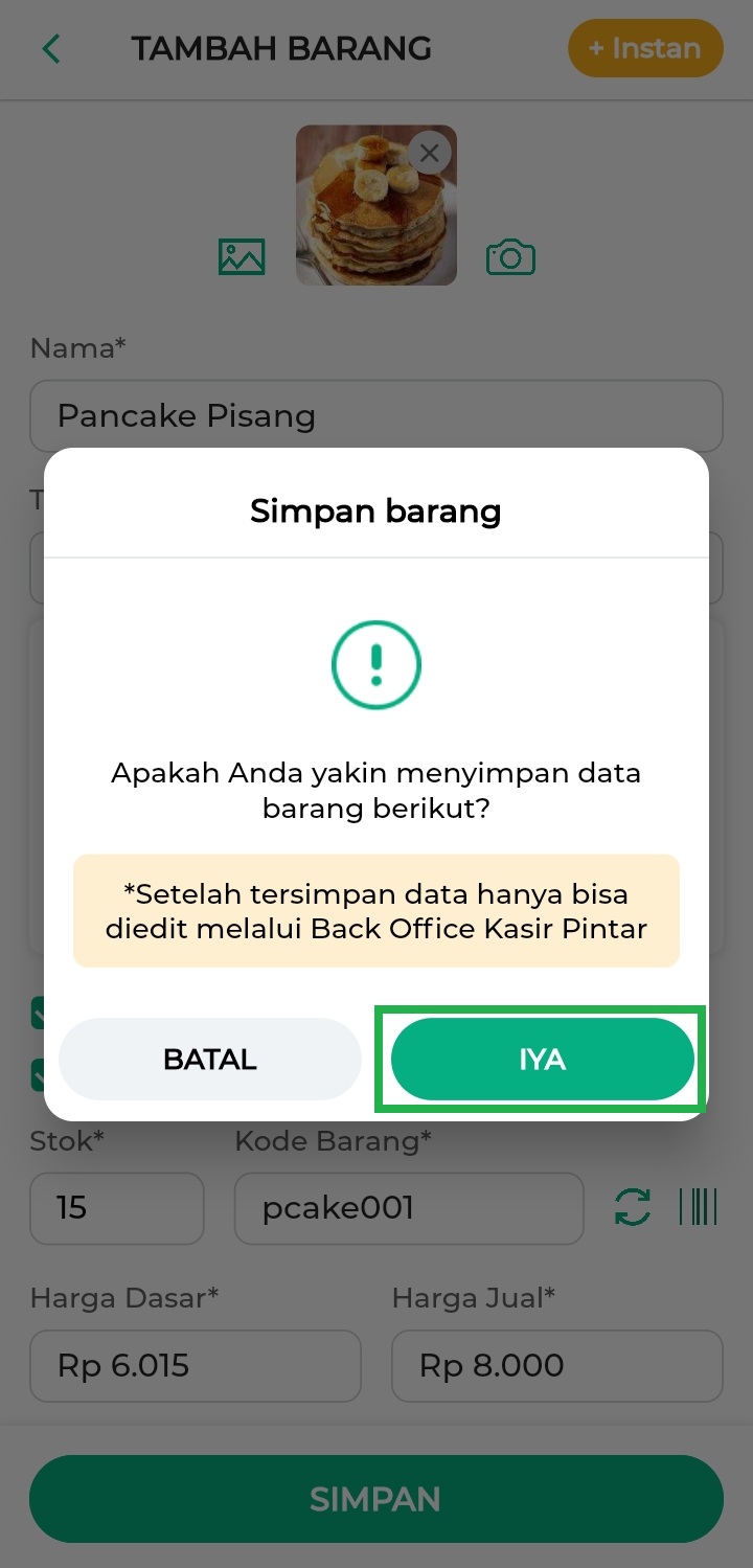 Sistem akan menampilkan halaman konfirmasi simpa barang seperti berikut, klik IYA.