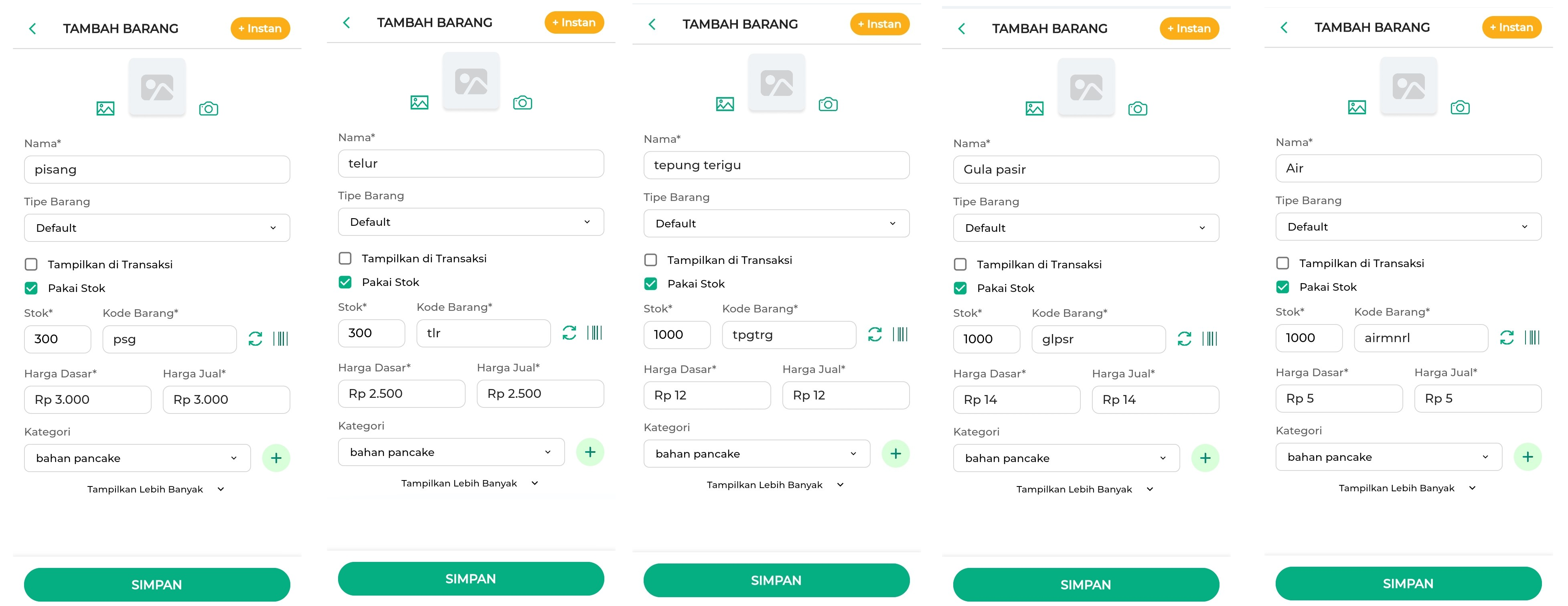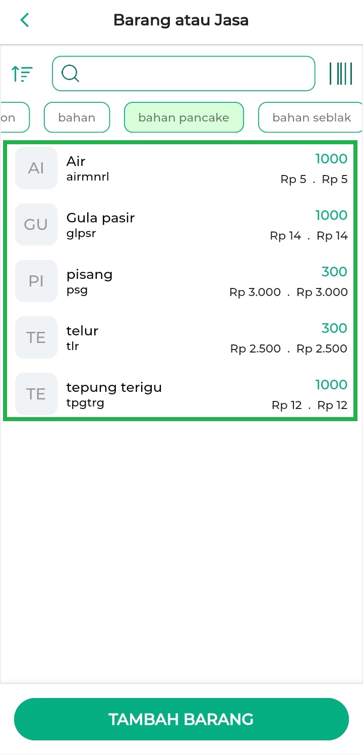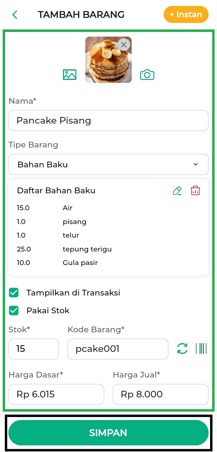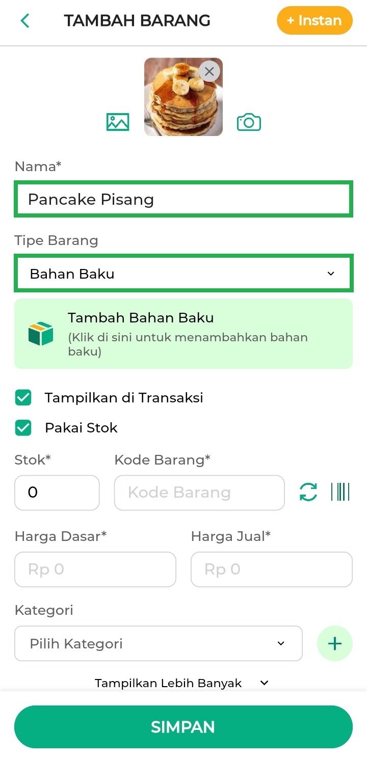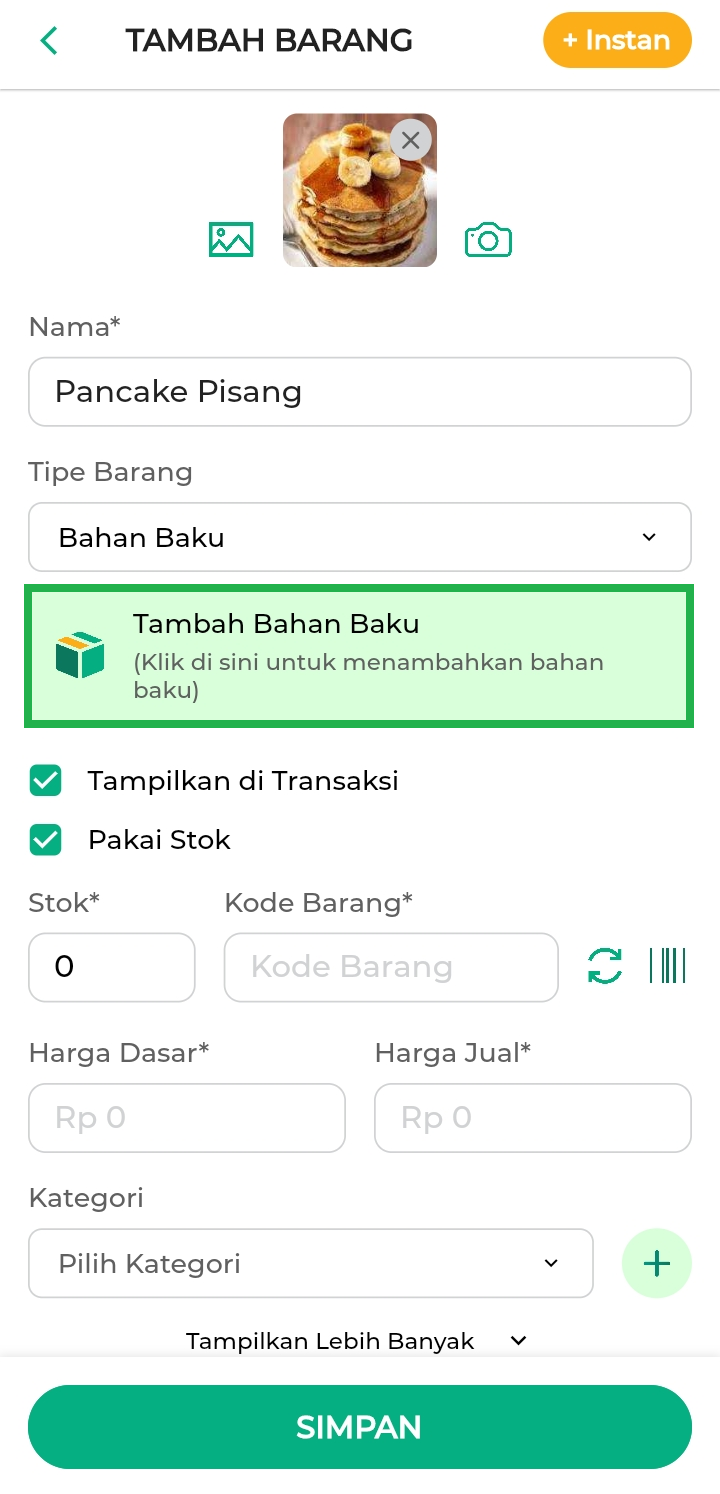 Contoh: Karis akan membuat barang tipe bahan baku dengan nama barang “Pancake Pisang”