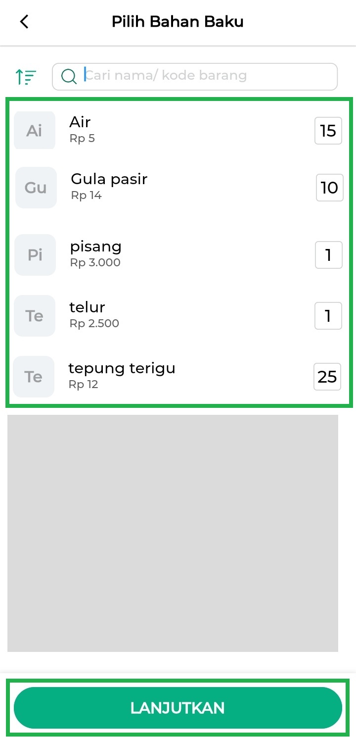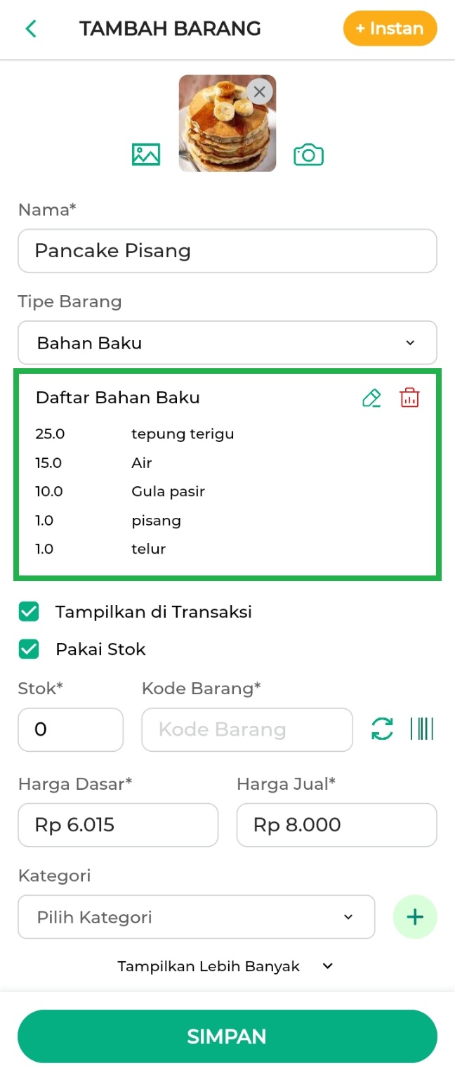 Contoh, Karis akan menambahkan barang berikut sebagai bahan baku untuk produk Pancake Pisang.