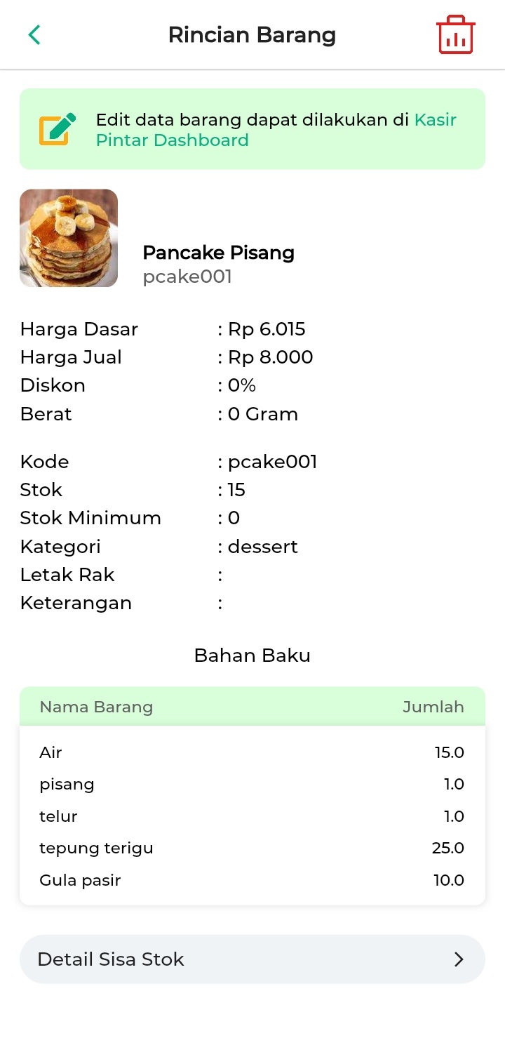 - Ketika barang bertipe “Bahan baku” terjual, stok bahan baku yang ada di dalamnya akan otomatis berkurang sesuai jumlah yang digunakan.