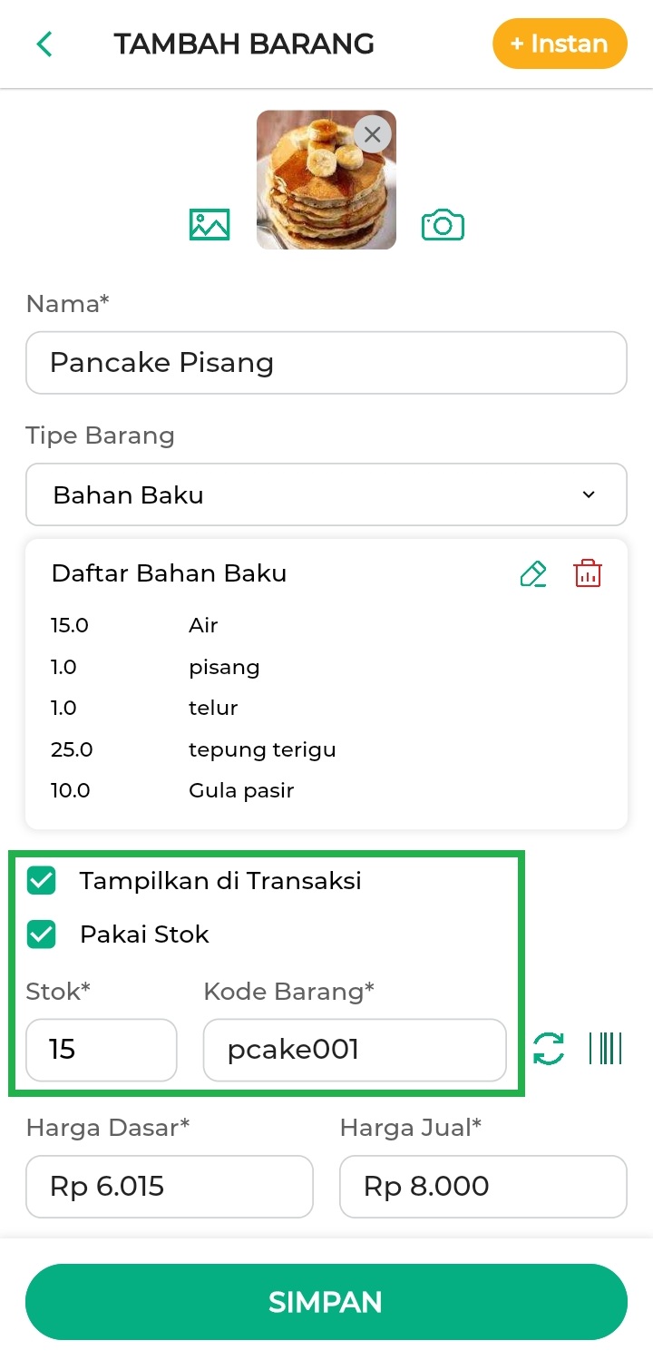 - Jika Anda mencentang opsi Pakai Stok maka Anda harus mengisi kolom Stok sesuai jumlah yang tersedia.