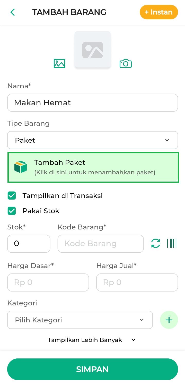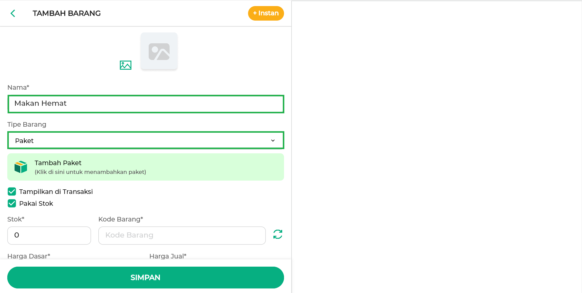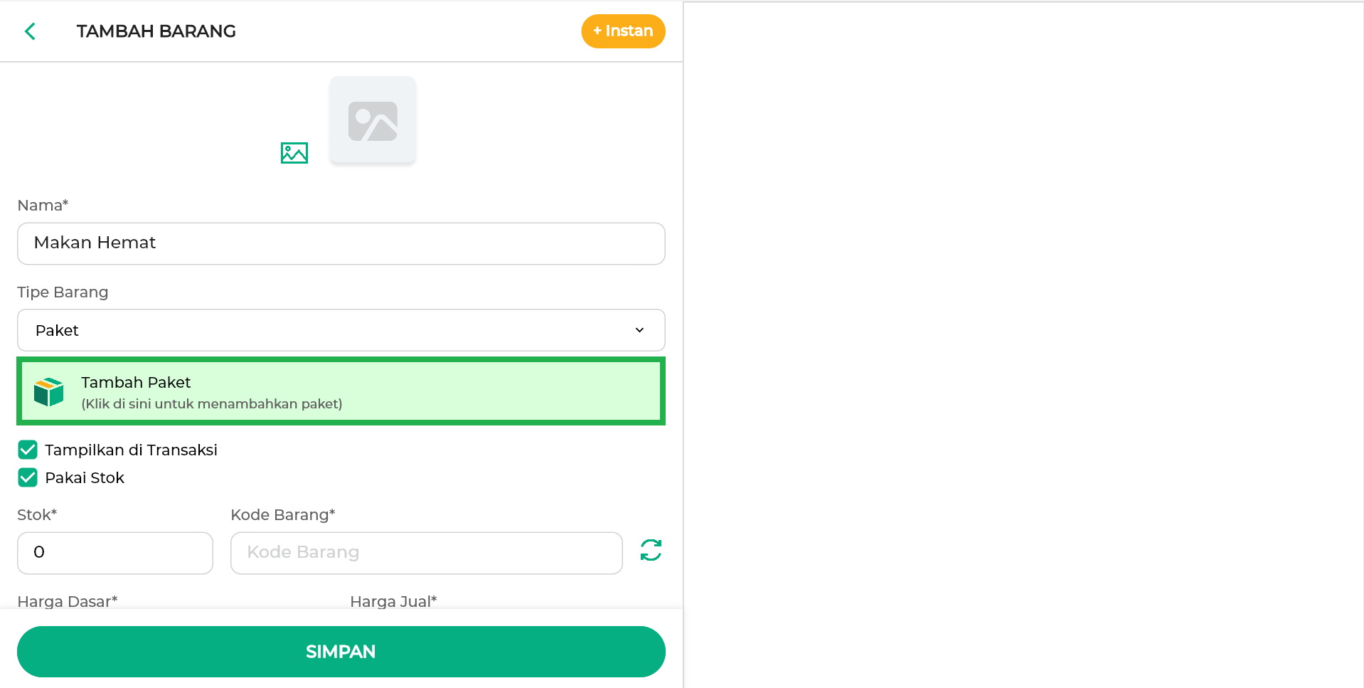 Contoh: Karis akan menambahkan paket Makan Hemat. - Klik tombol Tambah Paket untuk menambahkan barang paket.