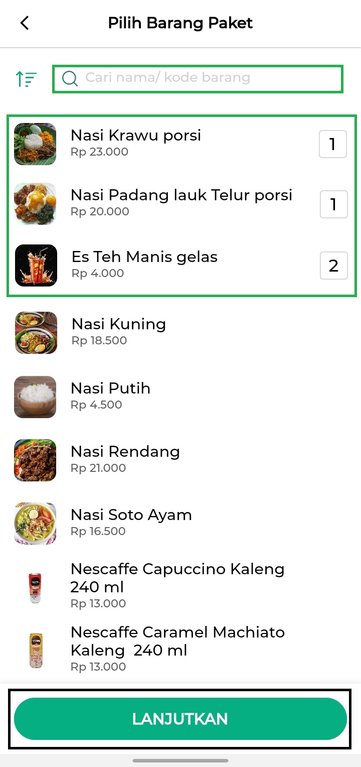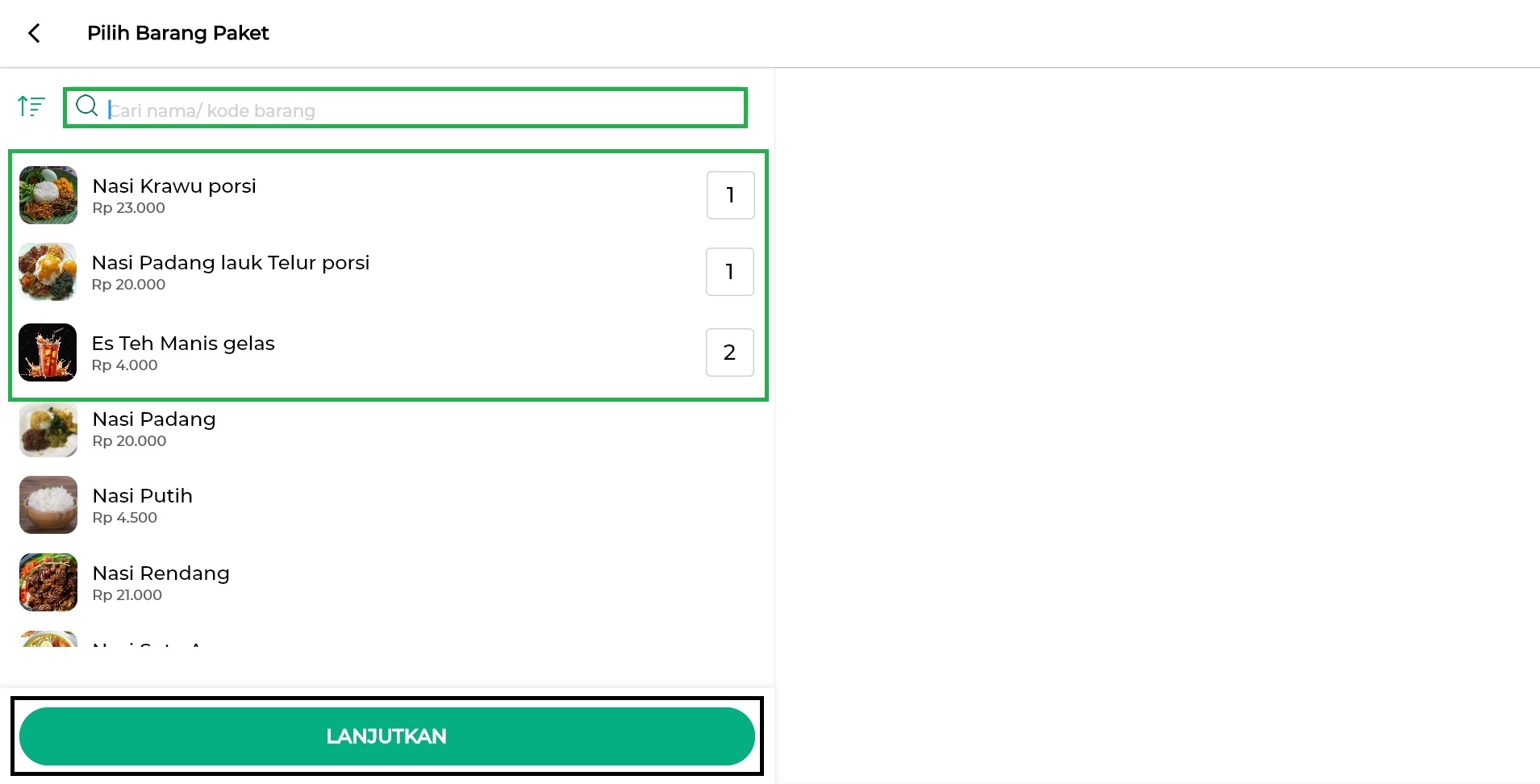- Pilih barang yang akan ditambahkan ke dalam rangkaian barang paket dengan cara klik data barang secara langsung atau cari data barang melalui kolom pencarian. Lalu, klik tombol Lanjutkan.