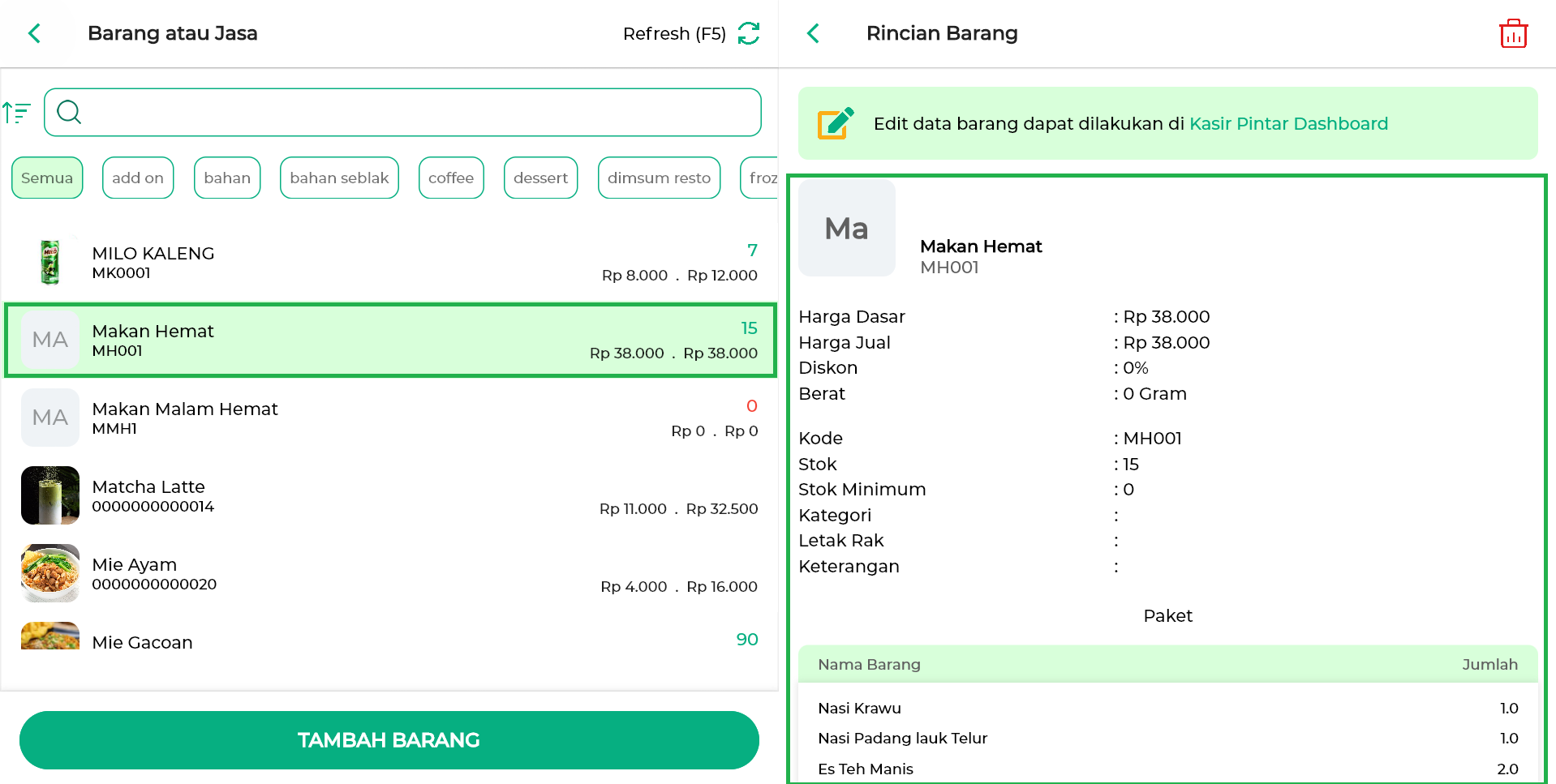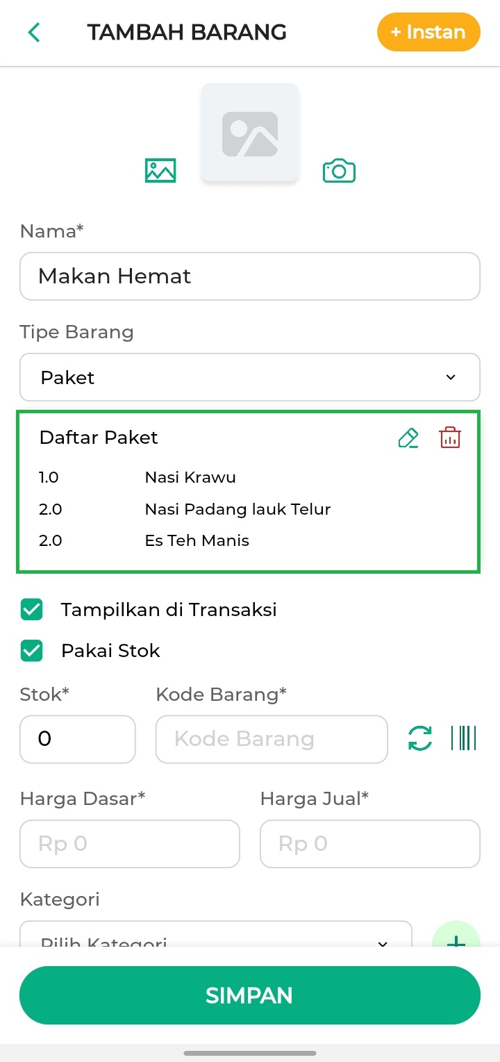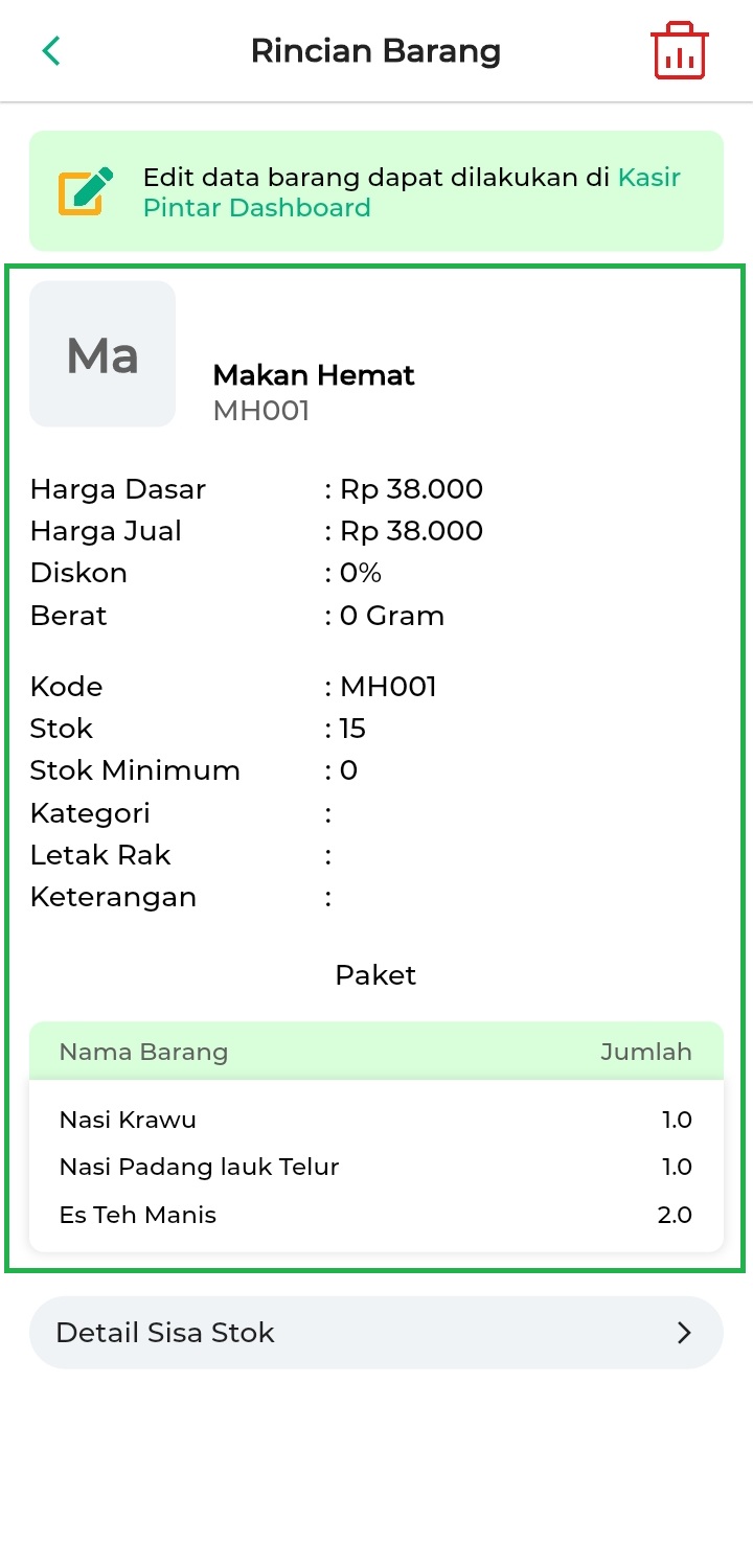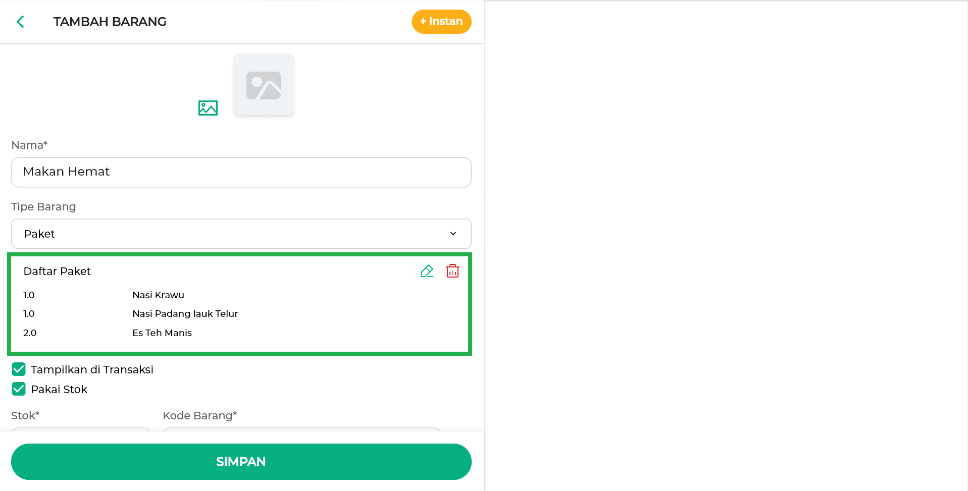 *Contoh: Jika barang paket Makan Hemat berisi Nasi Krawu, Nasi Padang Lauk Telur, dan Es Teh Manis, maka setiap kali paket ini terjual, stok ketiga barang tersebut akan berkurang secara otomatis sesuai jumlah yang ditentukan dalam paket.