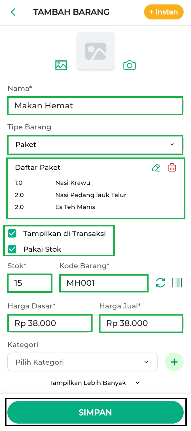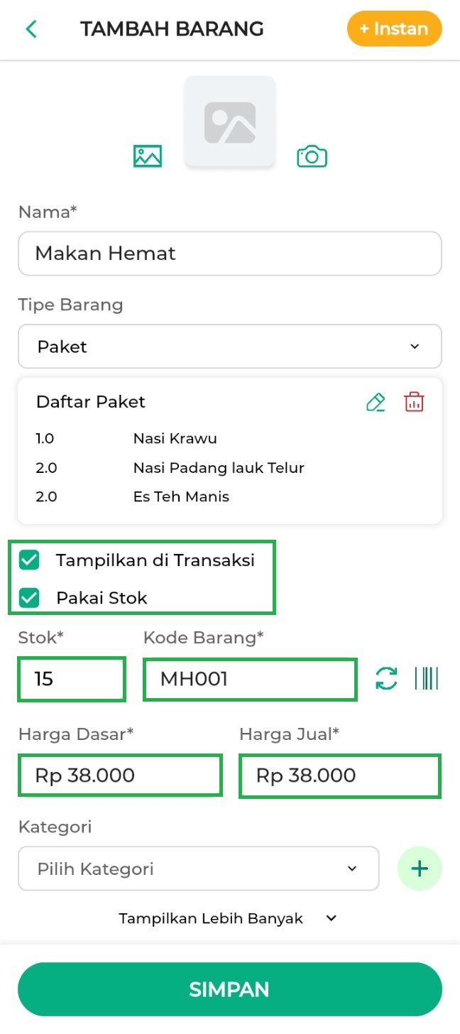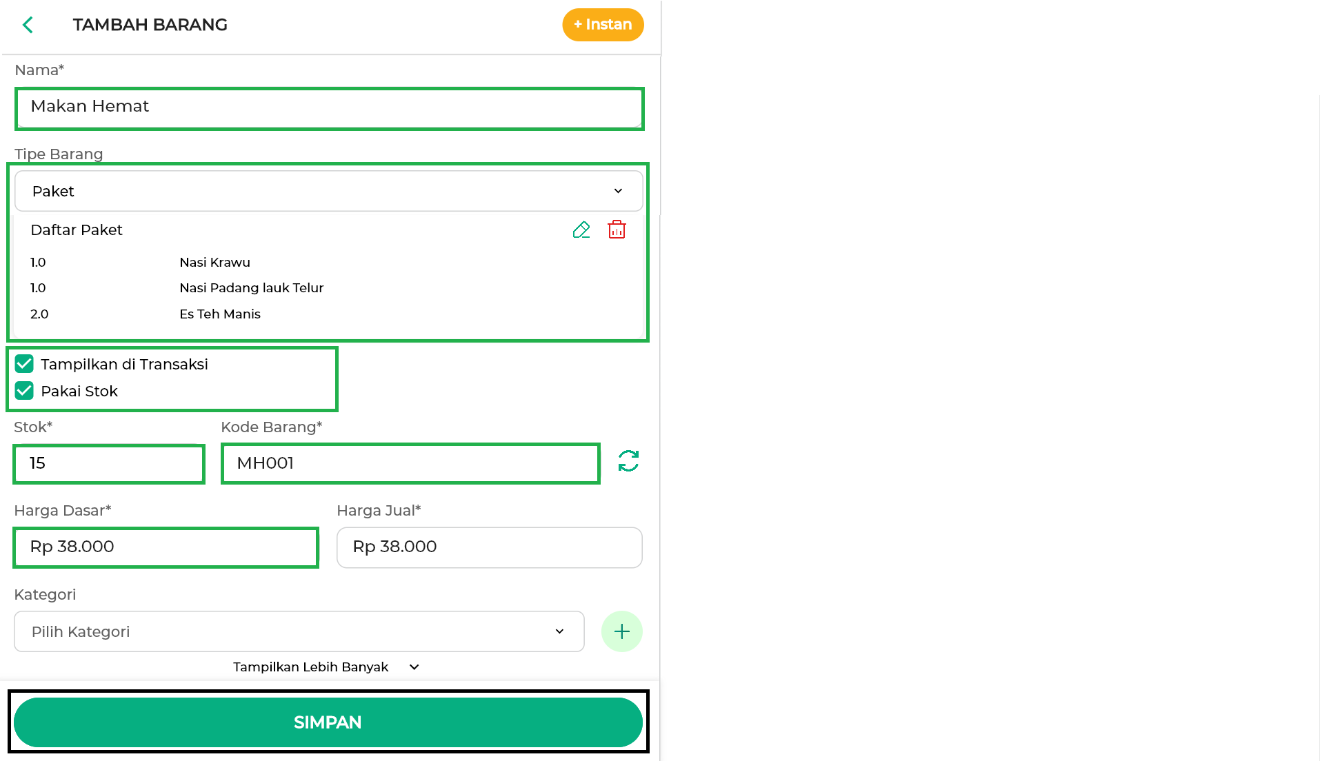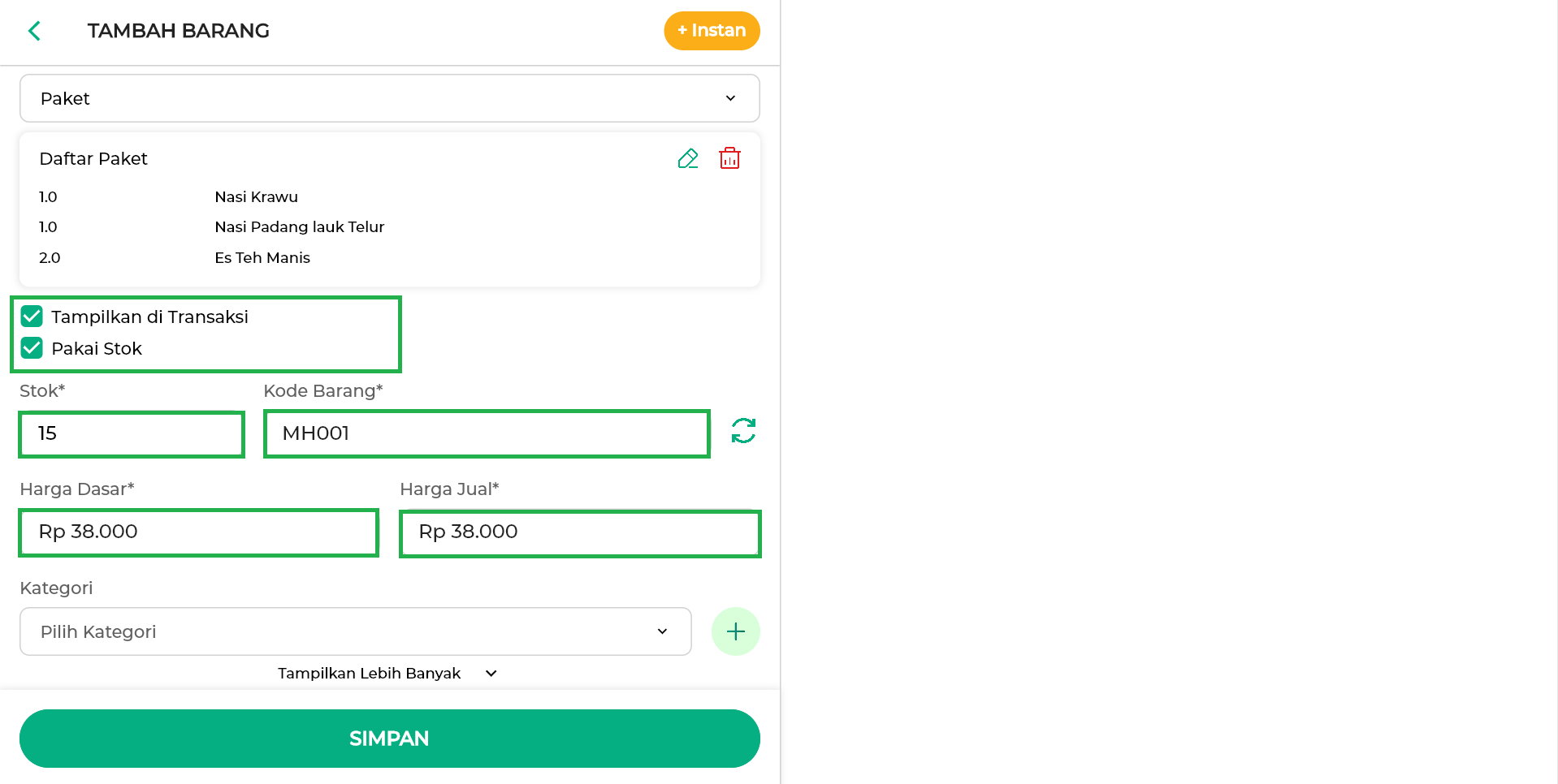 *Contoh: Jika barang paket Makan Hemat berisi Nasi Krawu, Nasi Padang Lauk Telur, dan Es Teh Manis, maka setiap kali paket ini terjual, stok ketiga barang tersebut akan berkurang secara otomatis sesuai jumlah yang ditentukan dalam paket.