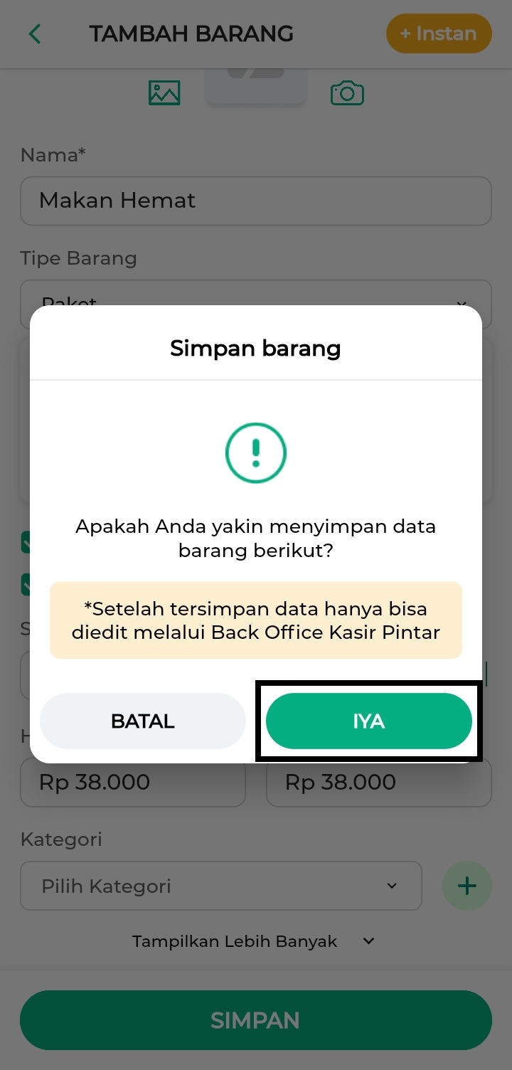 - Isi kolom Harga Dasar, Harga Jual, dan Kategori barang sesuai kebutuhan.