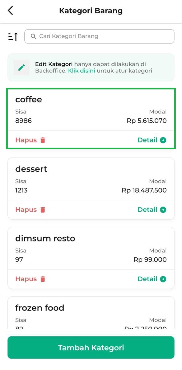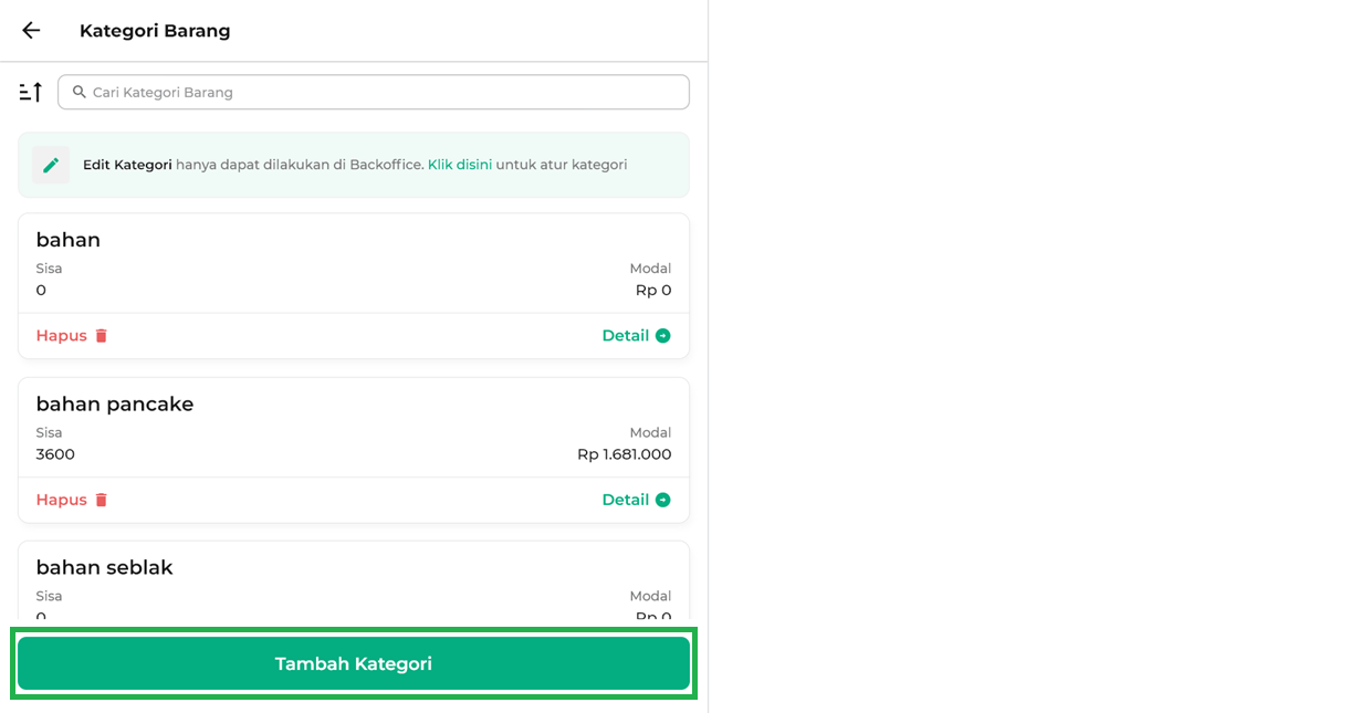 • Jika Anda ingin mengubah atau menghapus nama kategori, saat ini pengaturan tersebut hanya dapat dilakukan melalui Website / Backoffice Kasir Pintar pada menu Database > Kategori.