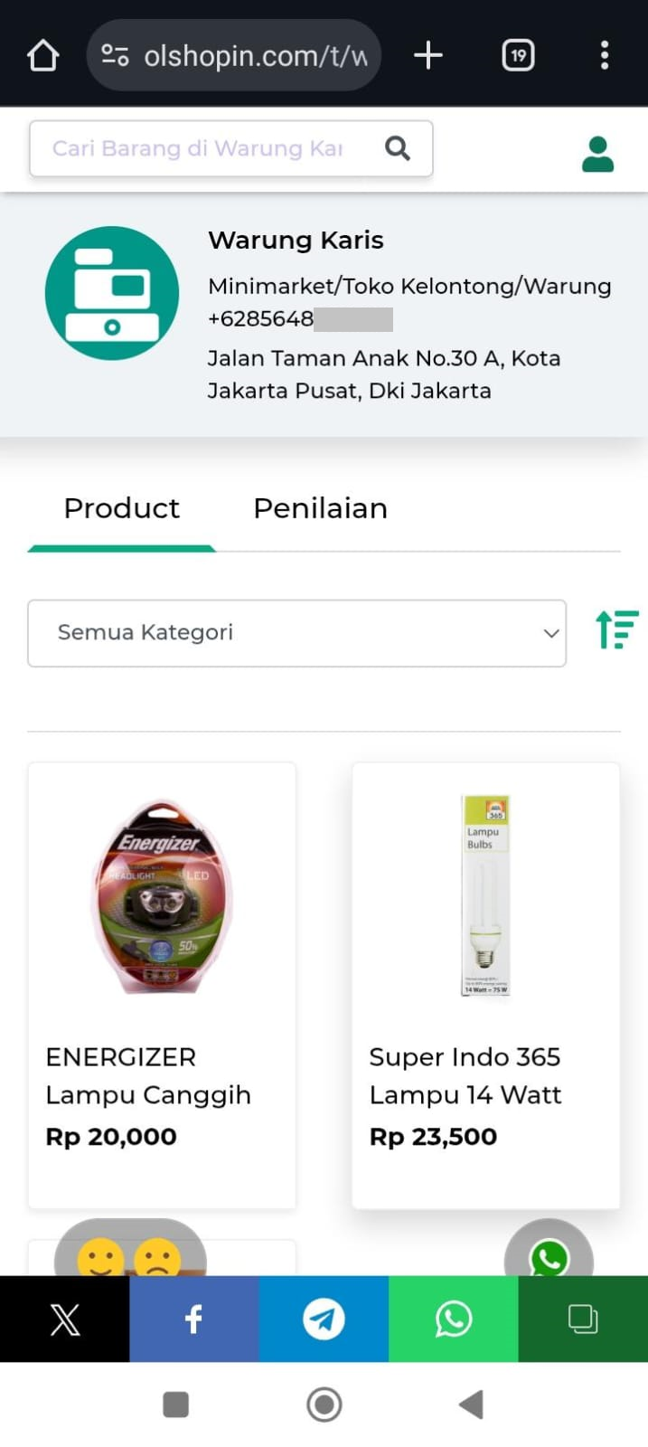 Tampilan pada contoh berikut merupakan toko online Warung Karis di Olshopin.