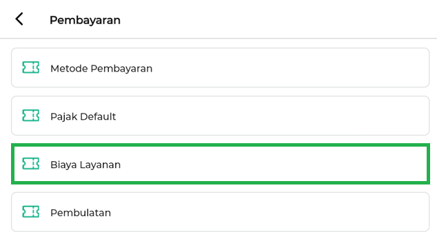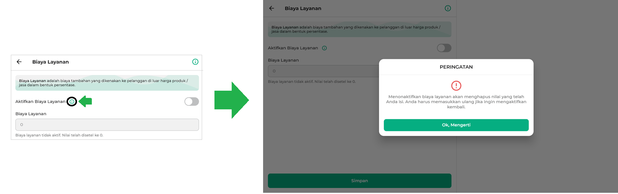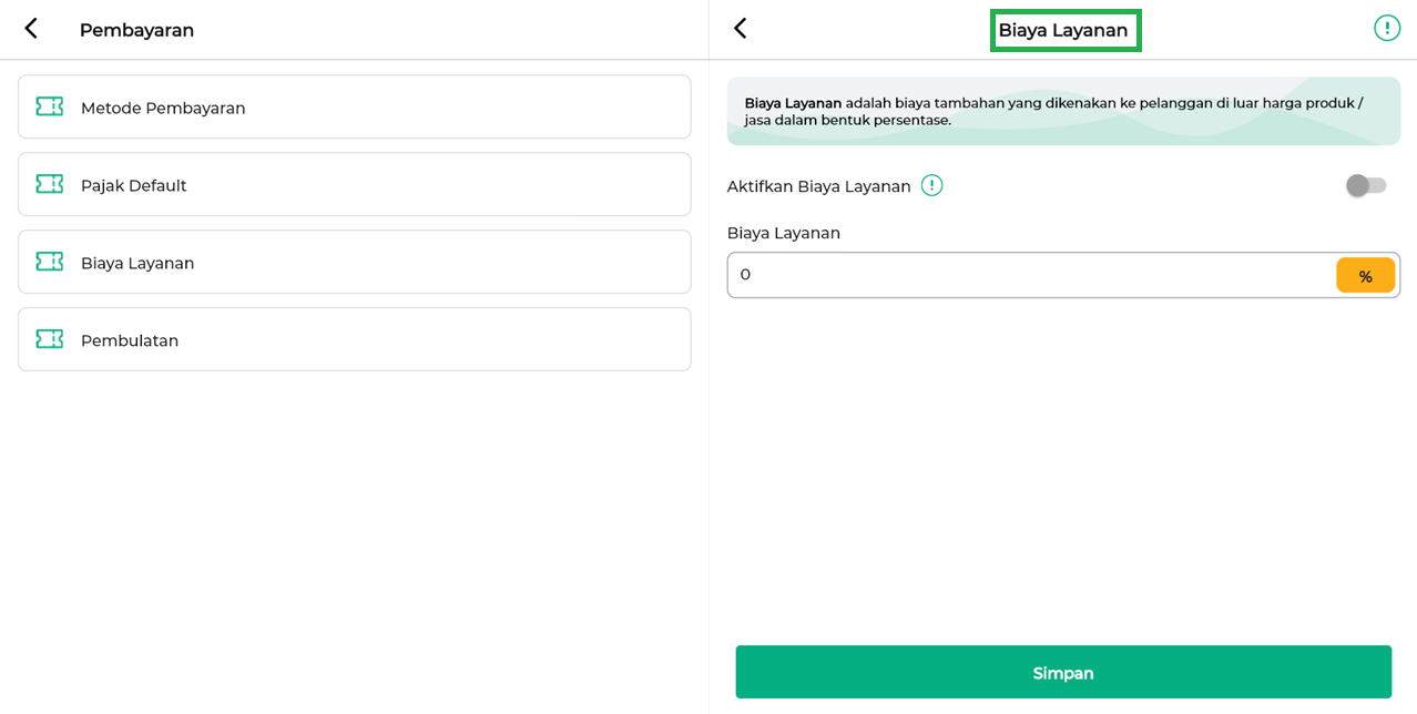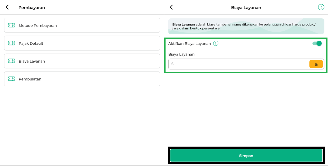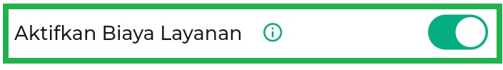 - Geser toggle Aktifkan Biaya Layanan hingga berwarna hijau untuk mengaktifkan biaya layanan.