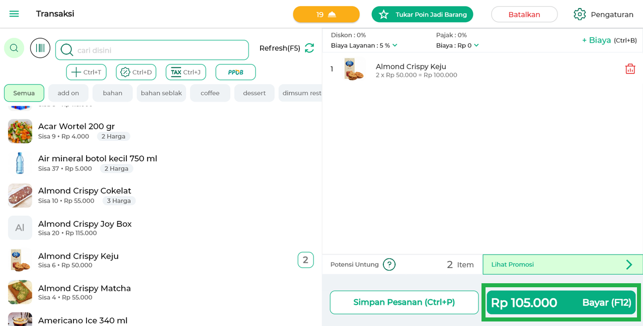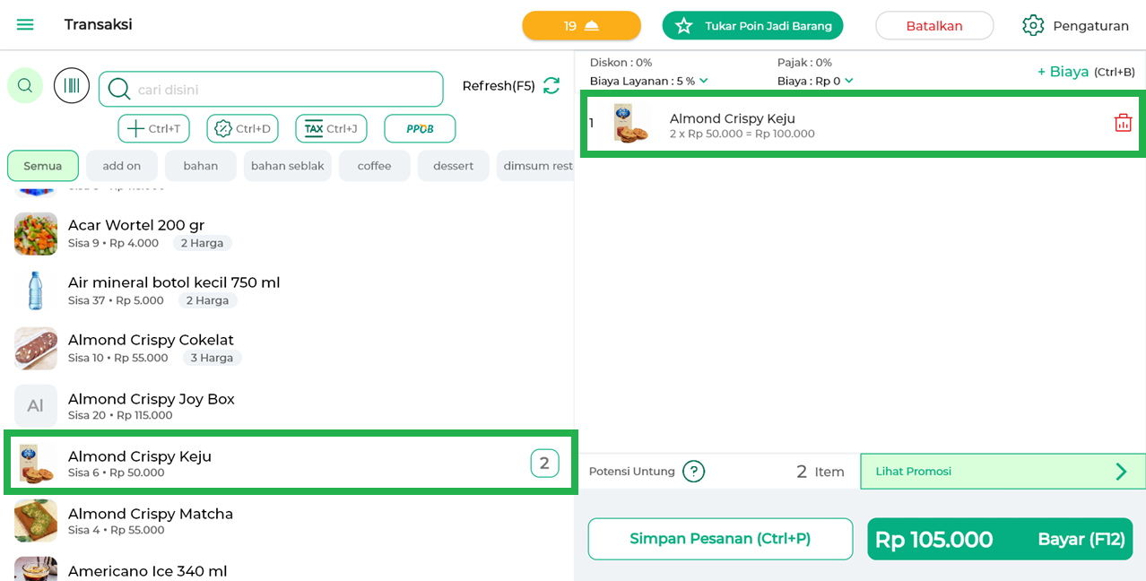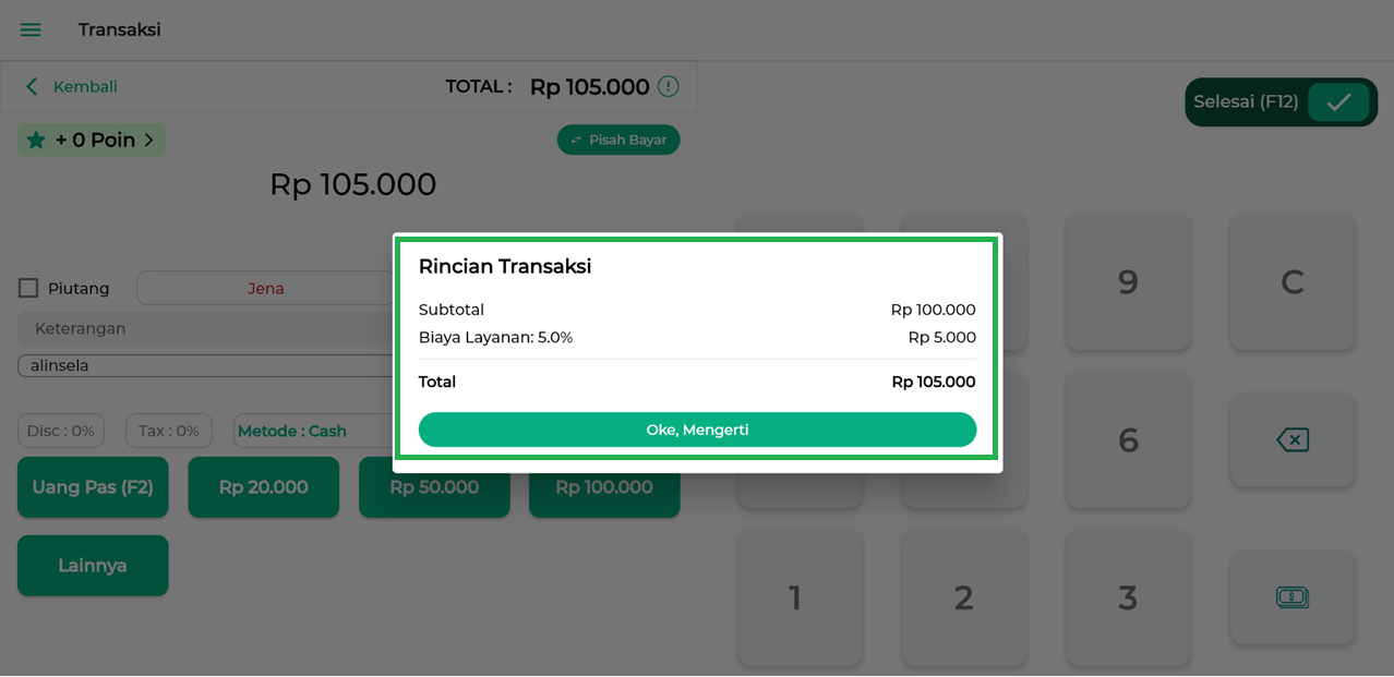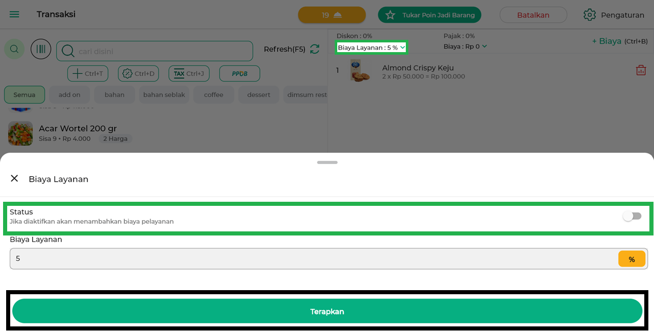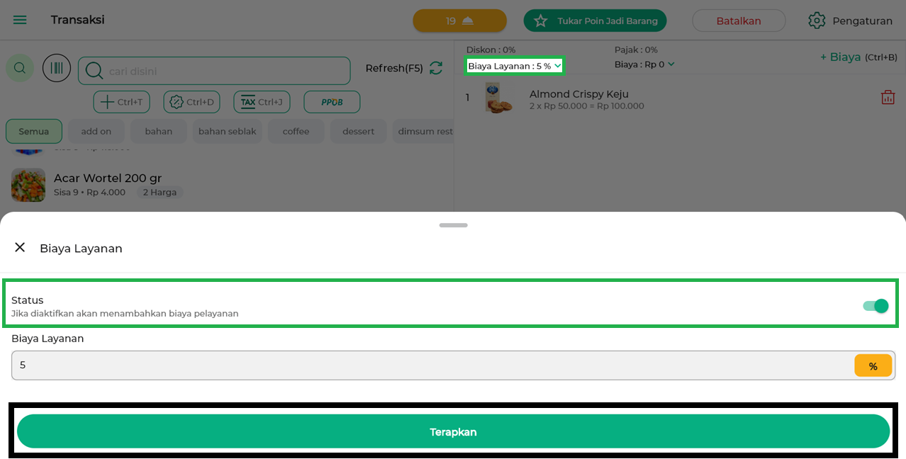Contoh: Karis ingin menerapkan biaya layanan sebesar 5% untuk transaksi penjualannya.