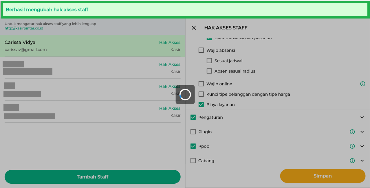 - Hak akses staf berhasil diaktifkan. Kini staf tersebut dapat mencatat transaksi penjualan dengan atau tanpa biaya layanan melalui pengaturan toggle Biaya Layanan.