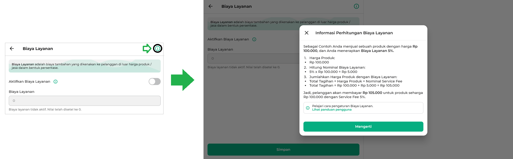 - Klik ikon ⓘ (informasi) yang berada di sebelah tulisan aktifkan biaya layanan untuk melihat informasi terkait toggle aktifkan biaya layanan.