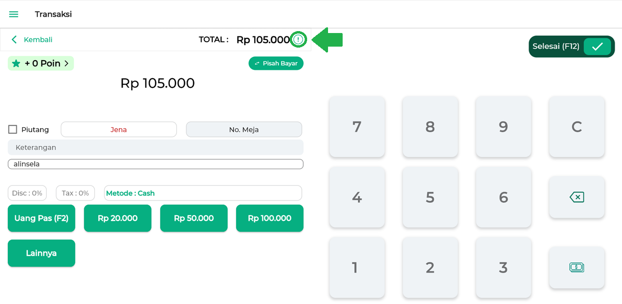 - Klik ikon ⓘ (informasi) di samping total transaksi untuk melihat rincian transaksi, termasuk biaya layanan, diskon, dan pajak (jika ada).