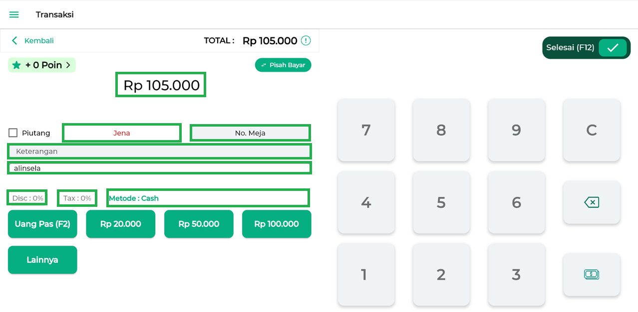 - Lengkapi semua data transaksi, seperti nominal pembayaran, nama pelanggan, meja, diskon, pajak, metode pembayaran, atau nama staf yang menerima komisi.